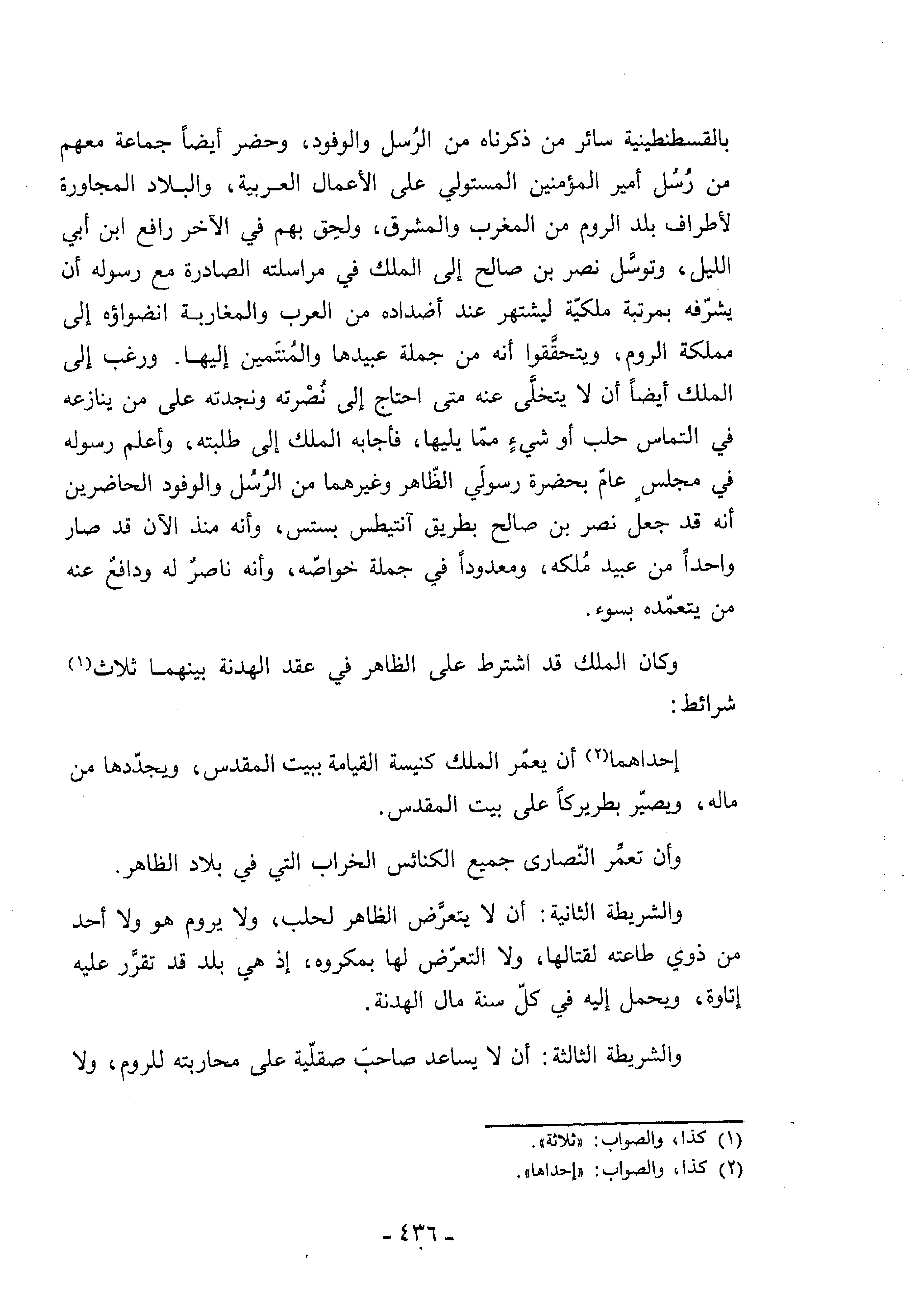 والشريطة الثانية: أن لا يتعرّض الظاهر لحلب، ولا يروم هو ولا أحد من ذوي طاعته لقتالها، ولا التعرّض لها بمكروه، إذ هي بلد قد تقرّر عليه إتاوة، ويحمل إليه في كلّ سنة مال الهدنة.