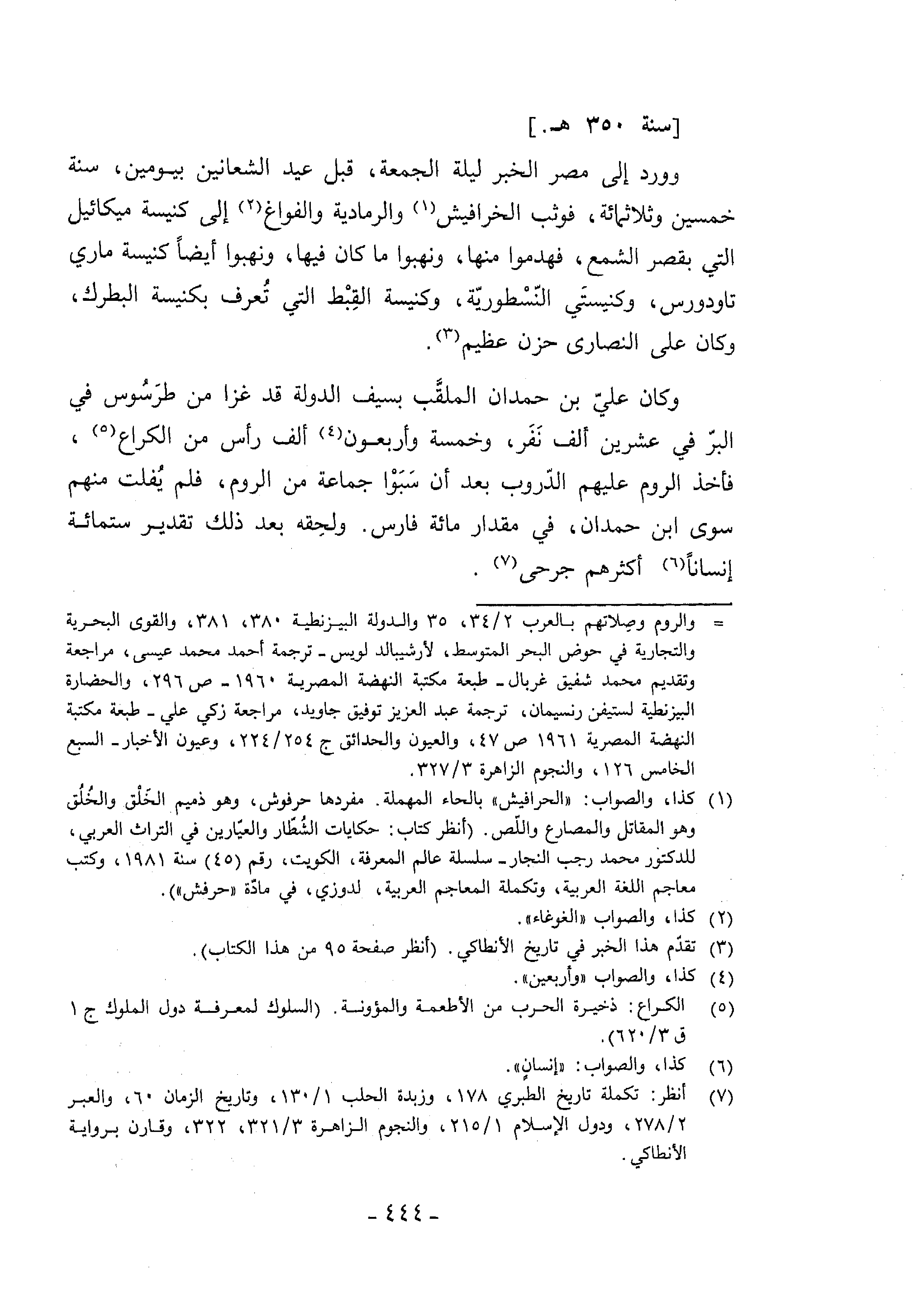 (¬7) أنظر: تكملة تاريخ الطبري 178، وزبدة الحلب 1/ 130، وتاريخ الزمان 60، والعبر 2/ 278، ودول الإسلام 1/ 215، والنجوم الزاهرة 3/ 321،322، وقارن برواية الأنطاكي.
