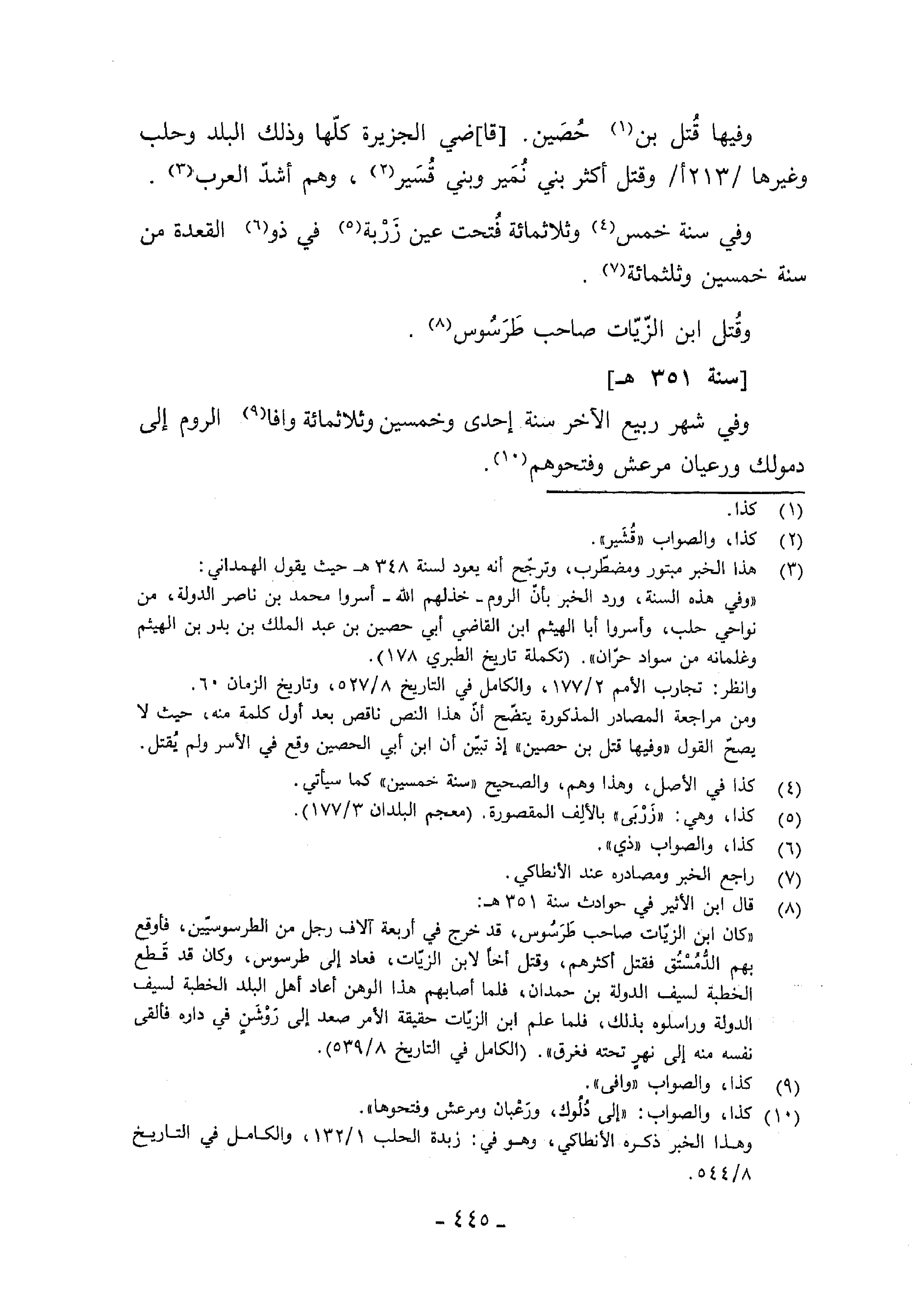 (¬3) هذا الخبر مبتور ومضطّرب، وترجّح أنه يعود لسنة 348 هـ حيث يقول الهمداني: «وفي هذه السنة، ورد الخبر بأنّ الروم-خذلهم الله-أسروا محمد بن ناصر الدولة، من نواحي حلب، وأسروا أبا الهيثم ابن القاضي أبي حصين بن عبد الملك بن بدر بن الهيثم وغلمانه من سواد حرّان». (تكملة تاريخ الطبري 178). وانظر: تجارب الأمم 2/ 177، والكامل في التاريخ 8/ 527، وتاريخ الزمان 60. ومن مراجعة المصادر المذكورة يتضّح أنّ هذا النص ناقص بعد أول كلمة منه، حيث لا يصحّ القول «وفيها قتل بن حصين» إذ تبيّن أن ابن أبي الحصين وقع في الأسر ولم يقتل.