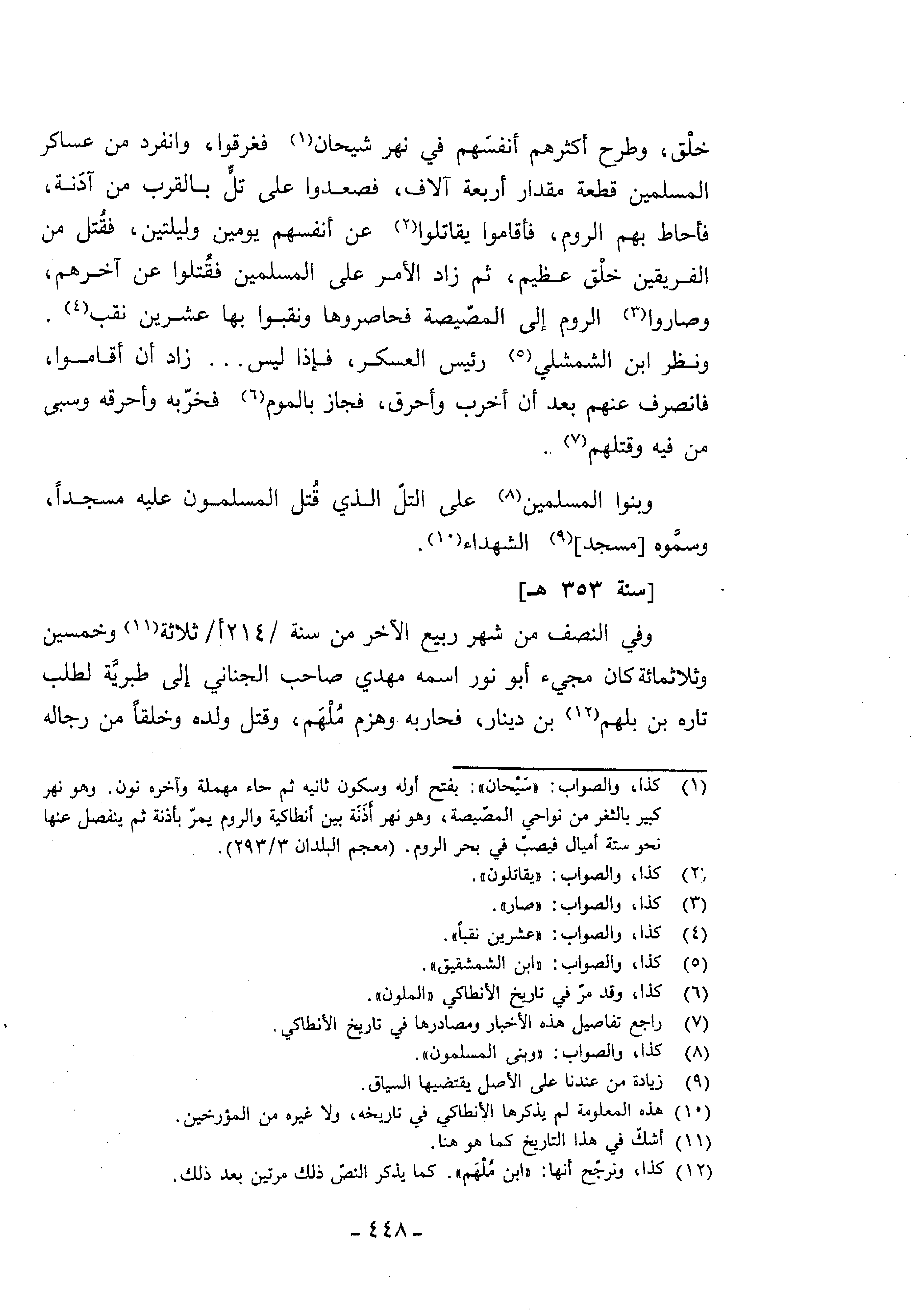 (¬1) كذا، والصواب: «سيحان»: بفتح أوله وسكون ثانيه ثم حاء مهملة وآخره نون. وهو نهر كبير بالثغر من نواحي المصّيصة، وهو نهر أذنة بين أنطاكية والروم يمرّ بأذنه ثم ينفصل عنها نحو ستة أميال فيصبّ في بحر الروم. (معجم البلدان 3/ 293).