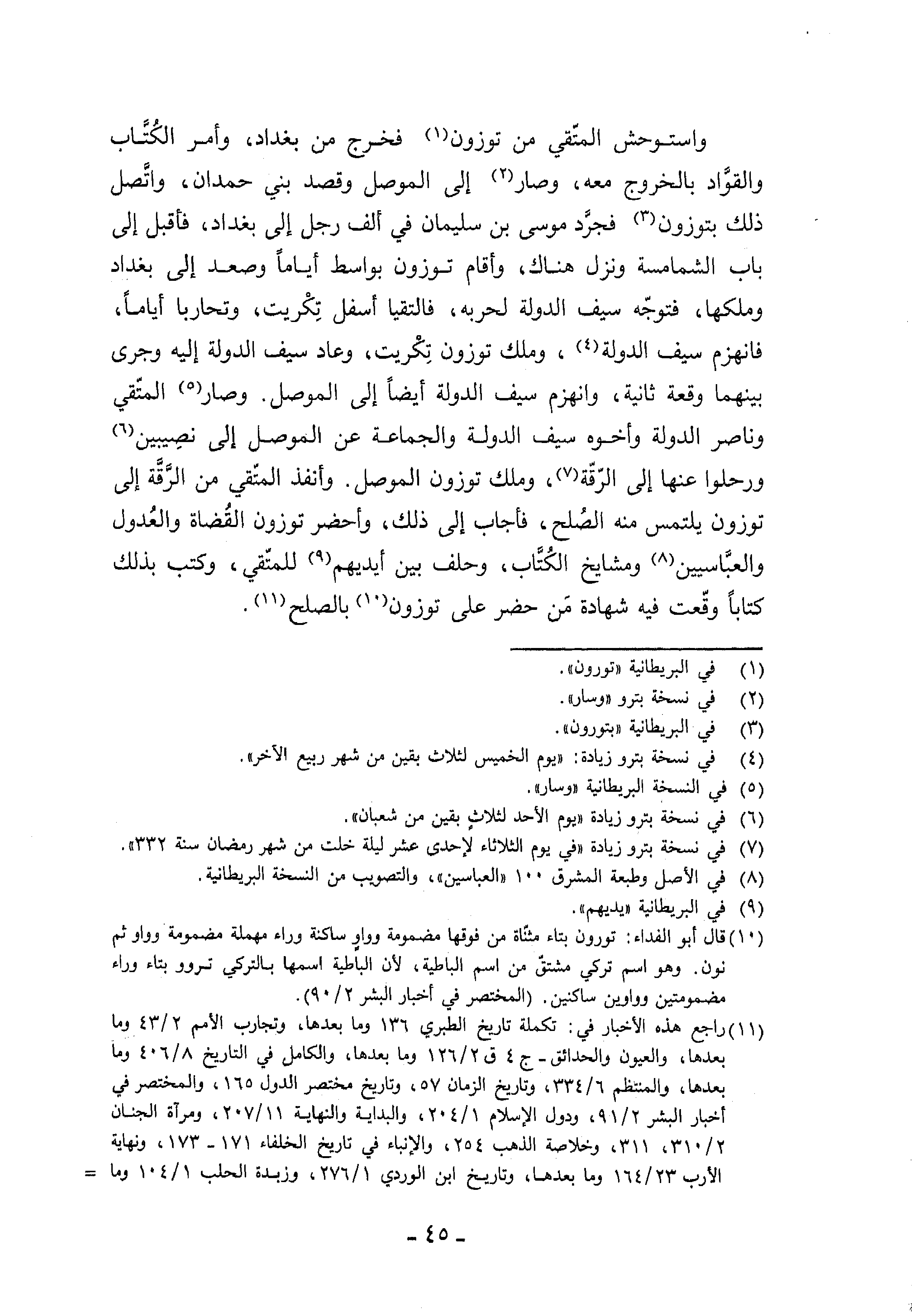 واستوحش المتّقي من توزون (¬1) فخرج من بغداد، وأمر الكتّاب والقوّاد بالخروج معه، وصار (¬2) إلى الموصل وقصد بني حمدان، واتّصل ذلك بتوزون (¬3) فجرّد موسى بن سليمان في ألف رجل إلى بغداد، فأقبل إلى باب الشمامسة ونزل هناك، وأقام توزون بواسط أياما وصعد إلى بغداد وملكها، فتوجّه سيف الدولة لحربه، فالتقيا أسفل تكريت، وتحاربا أياما، فانهزم سيف الدولة (¬4)، وملك توزون تكريت، وعاد سيف الدولة إليه وجرى بينهما وقعة ثانية، وانهزم سيف الدولة أيضا إلى الموصل. وصار (¬5) المتّقي وناصر الدولة وأخوه سيف الدولة والجماعة عن الموصل إلى نصيبين (¬6) ورحلوا عنها إلى الرّقّة (¬7)، وملك توزون الموصل. وأنفذ المتّقي من الرّقّة إلى توزون يلتمس منه الصلح، فأجاب إلى ذلك، وأحضر توزون القضاة والعدول والعبّاسيين (¬8) ومشايخ الكتّاب، وحلف بين أيديهم (¬9) للمتّقي، وكتب بذلك كتابا وقّعت فيه شهادة من حضر على توزون (¬10) بالصلح (¬11).