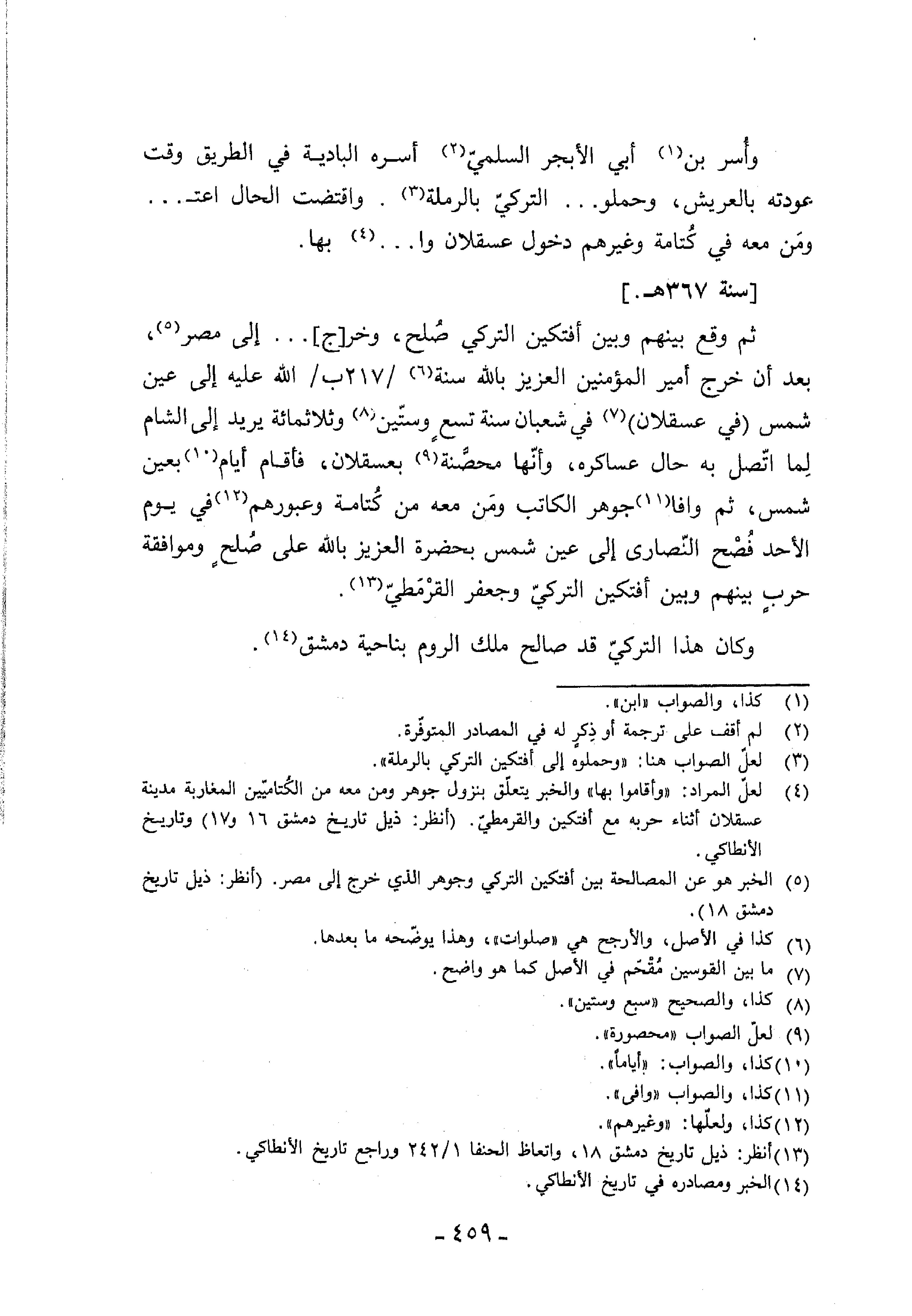 (¬5) الخبر هو عن المصالحة بين أفتكين التركي وجوهر الذي خرج إلى مصر. (أنظر: ذيل تاريخ دمشق 18).