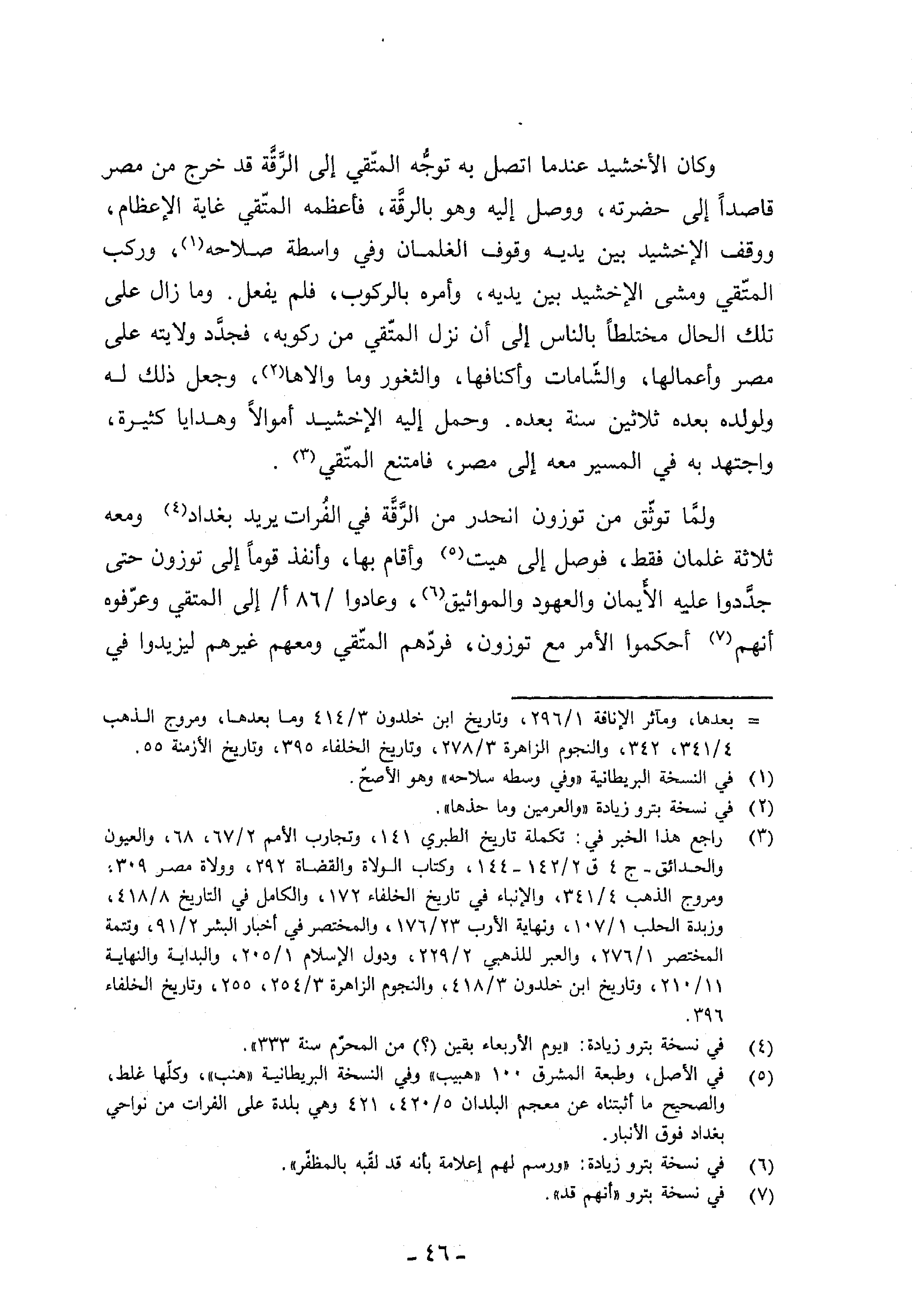 (¬3) راجع هذا الخبر في: تكملة تاريخ الطبري 141، وتجارب الأمم 2/ 67،68، والعيون والحدائق-ج 4 ق 2/ 142 - 144، وكتاب الولاة والقضاة 292، وولاة مصر 309، ومروج الذهب 4/ 341، والإنباء في تاريخ الخلفاء 172، والكامل في التاريخ 8/ 418، وزبدة الحلب 1/ 107، ونهاية الأرب 23/ 176، والمختصر في أخبار البشر 2/ 91، وتتمة المختصر 1/ 276، والعبر للذهبي 2/ 229، ودول الإسلام 1/ 205، والبداية والنهاية 11/ 210، وتاريخ ابن خلدون 3/ 418، والنجوم الزاهرة 3/ 254،255، وتاريخ الخلفاء 396.
