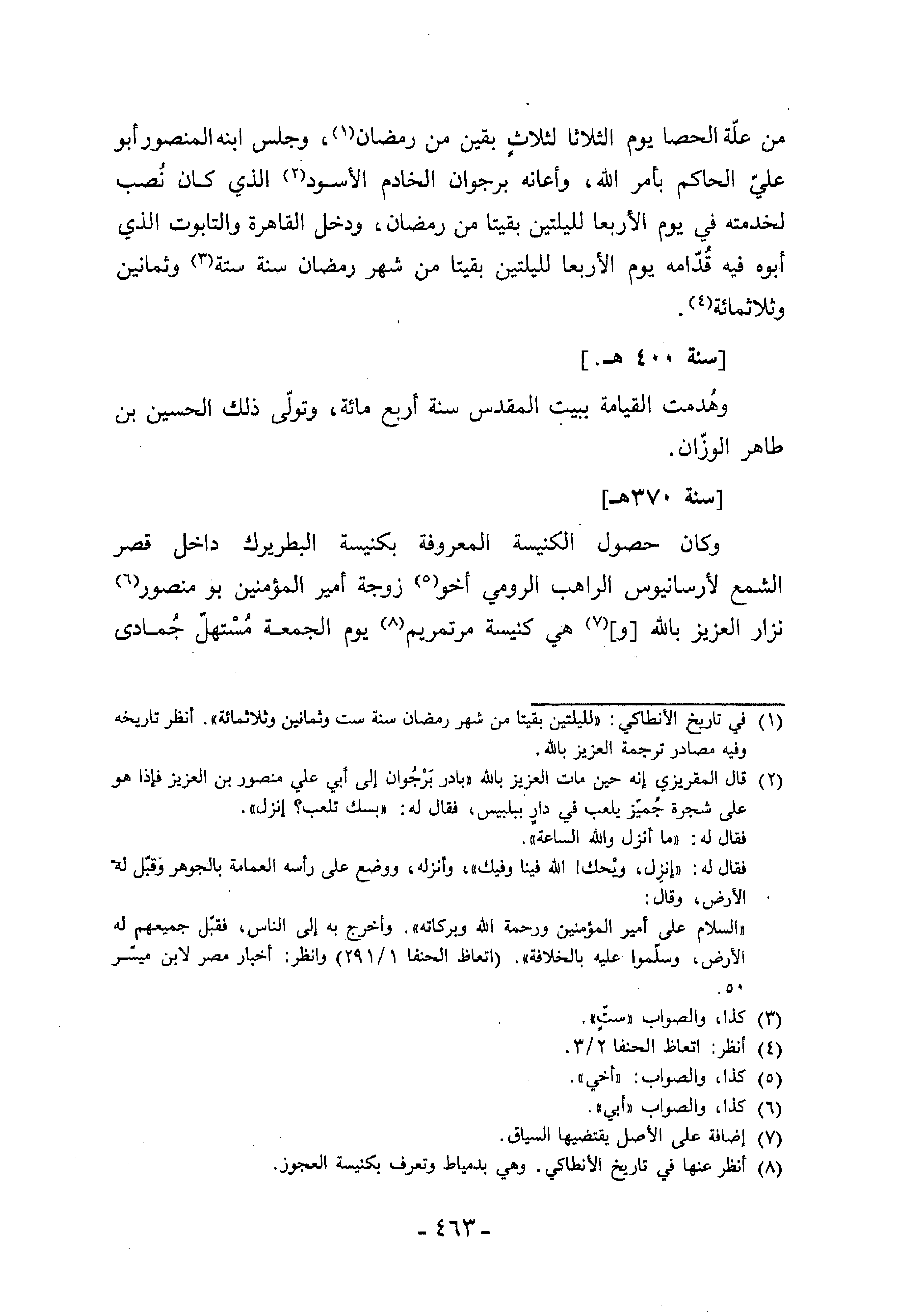 (¬1) في تاريخ الأنطاكي: «لليلتين بقيتا من شهر رمضان سنة ست وثمانين وثلاثمائة». أنظر تاريخه وفيه مصادر ترجمة العزيز بالله.
