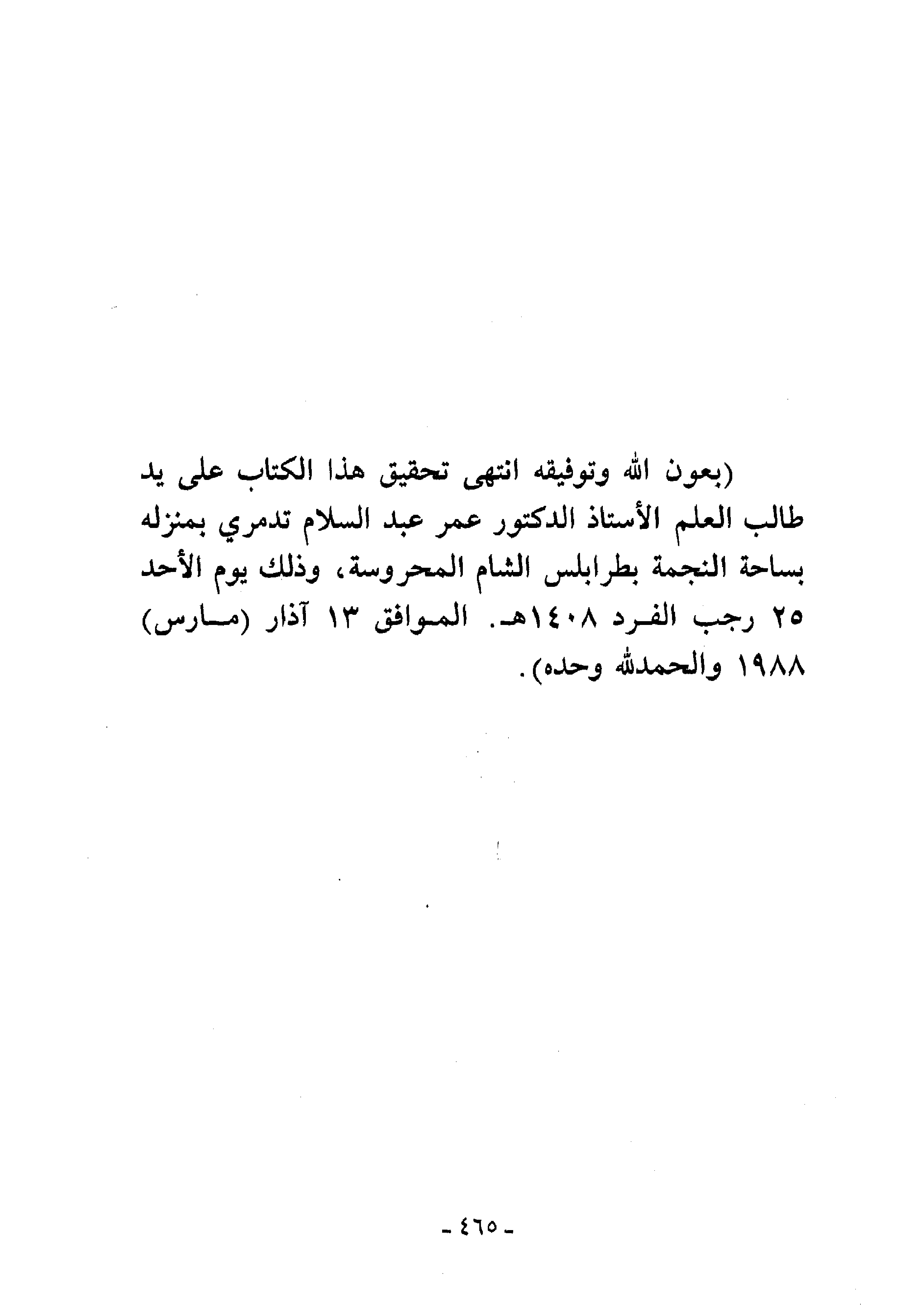 (بعون الله وتوفيقه انتهى تحقيق هذا الكتاب على يد طالب العلم الأستاذ الدكتور عمر عبد السلام تدمري بمنزله بساحة النجمة بطرابلس الشام المحروسة، وذلك يوم الأحد 25 رجب الفرد 1408 هـ. الموافق 13 آذار (مارس) 1988 والحمد لله وحده).