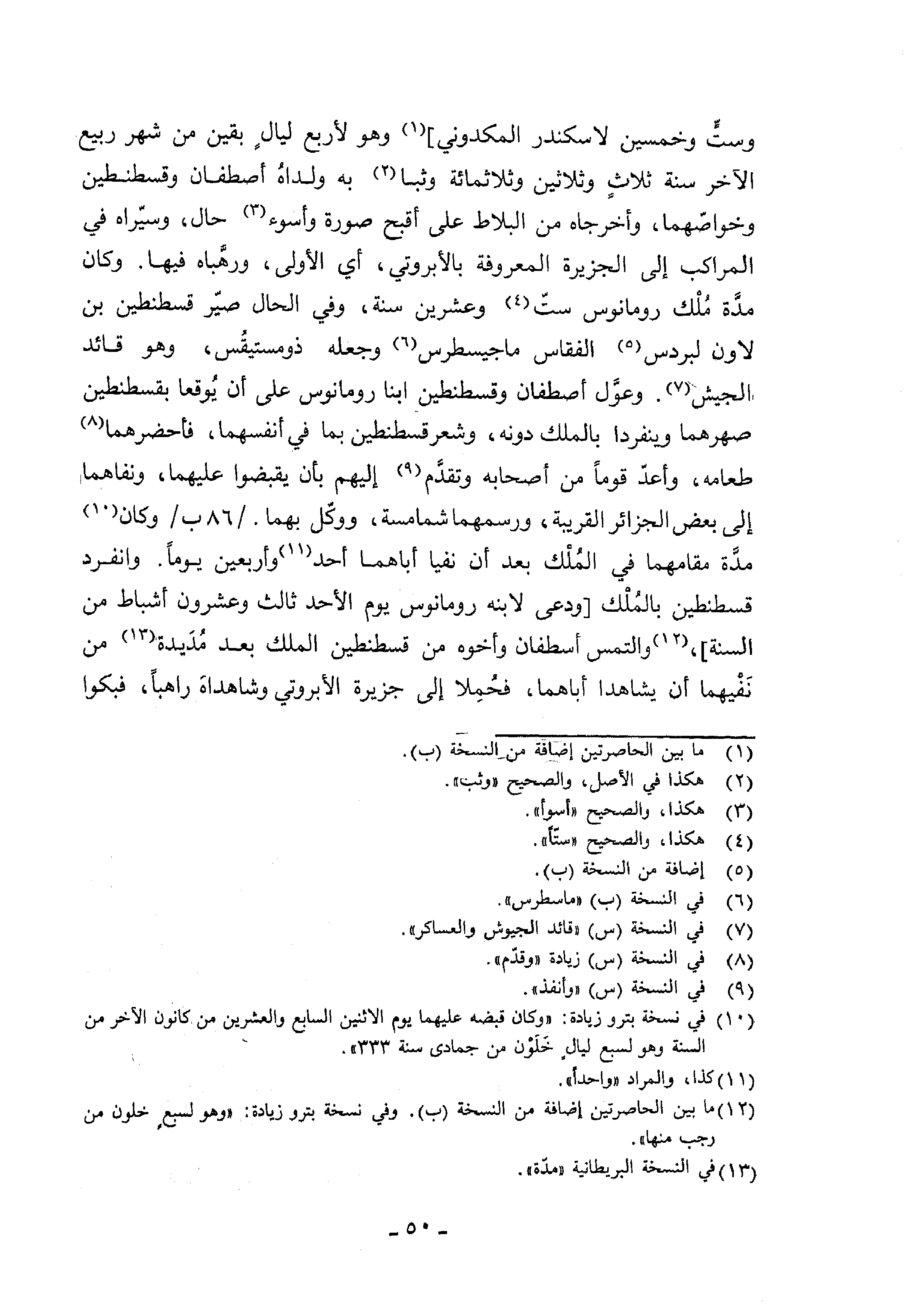 ونفاهما إلى بعض الجزائر القريبة، ورسمهما شمامسة، ووكّل بهما. /86 ب/وكان (¬10) مدّة مقامهما في الملك بعد أن نفيا أباهما أحد (¬11) وأربعين يوما. وانفرد قسطنطين بالملك [ودعى لابنه رومانوس يوم الأحد ثالث وعشرون أشباط من السنة]، (¬12) والتمس أسطفان وأخوه من قسطنطين الملك بعد مديدة (¬13) من نفيهما أن يشاهدا أباهما، فحملا إلى جزيرة الأبروتي وشاهداه راهبا، فبكوا