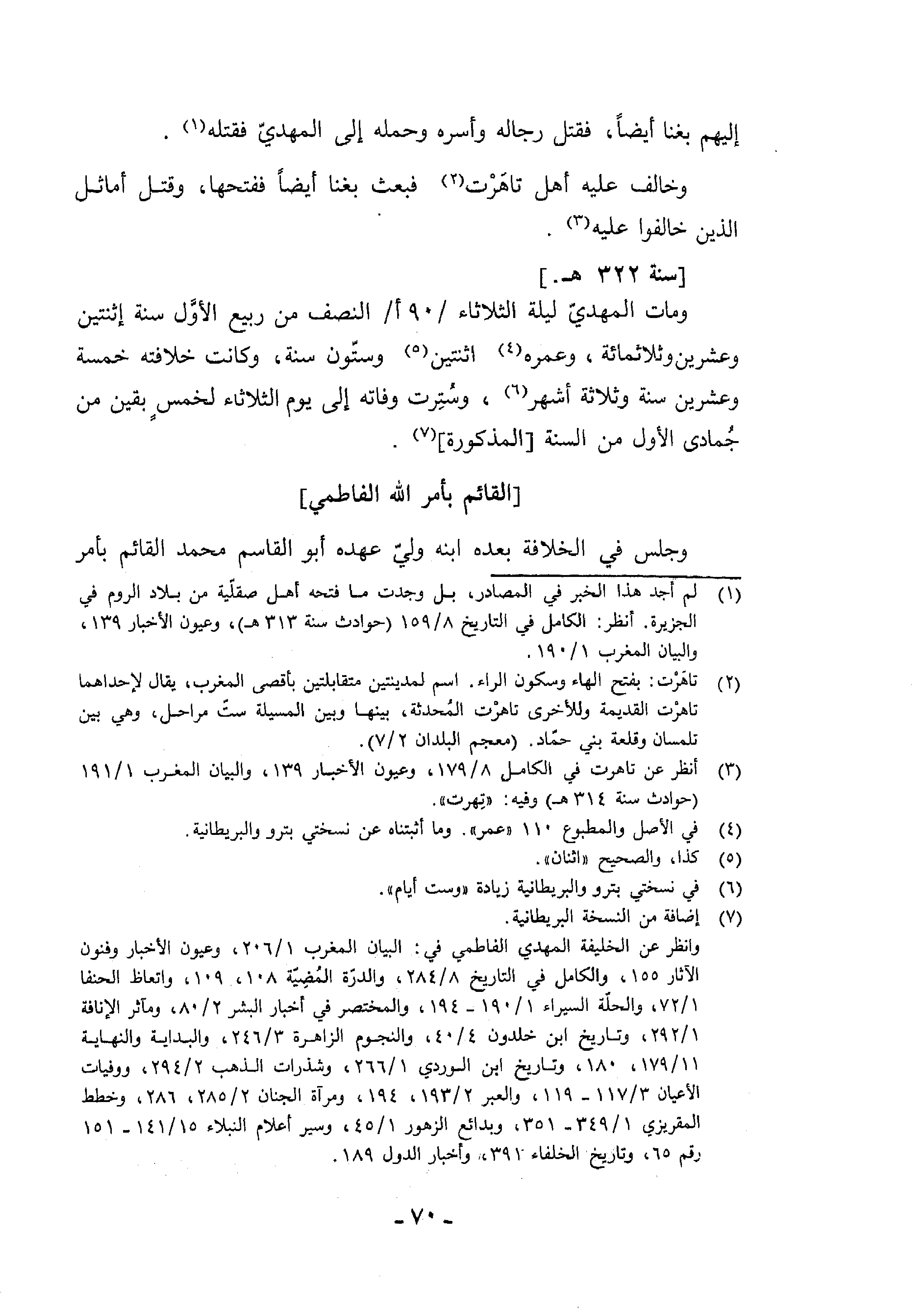 (¬7) إضافة من النسخة البريطانية. وانظر عن الخليفة المهدي الفاطمي في: البيان المغرب 1/ 206، وعيون الأخبار وفنون الآثار 155، والكامل في التاريخ 8/ 284، والدرّة المضيّة 108،109، واتعاظ الحنفا 1/ 72، والحلّة السيراء 1/ 190 - 194، والمختصر في أخبار البشر 2/ 80، ومآثر الإنافة 1/ 292، وتاريخ ابن خلدون 4/ 40، والنجوم الزاهرة 3/ 246، والبداية والنهاية 11/ 179،180، وتاريخ ابن الوردي 1/ 266، وشذرات الذهب 2/ 294، ووفيات الأعيان 3/ 117 - 119، والعبر 2/ 193،194، ومرآة الجنان 2/ 285،286، وخطط المقريزي 1/ 349 - 351، وبدائع الزهور 1/ 45، وسير أعلام النبلاء 15/ 141 - 151 رقم 65، وتاريخ الخلفاء 391، وأخبار الدول 189.
