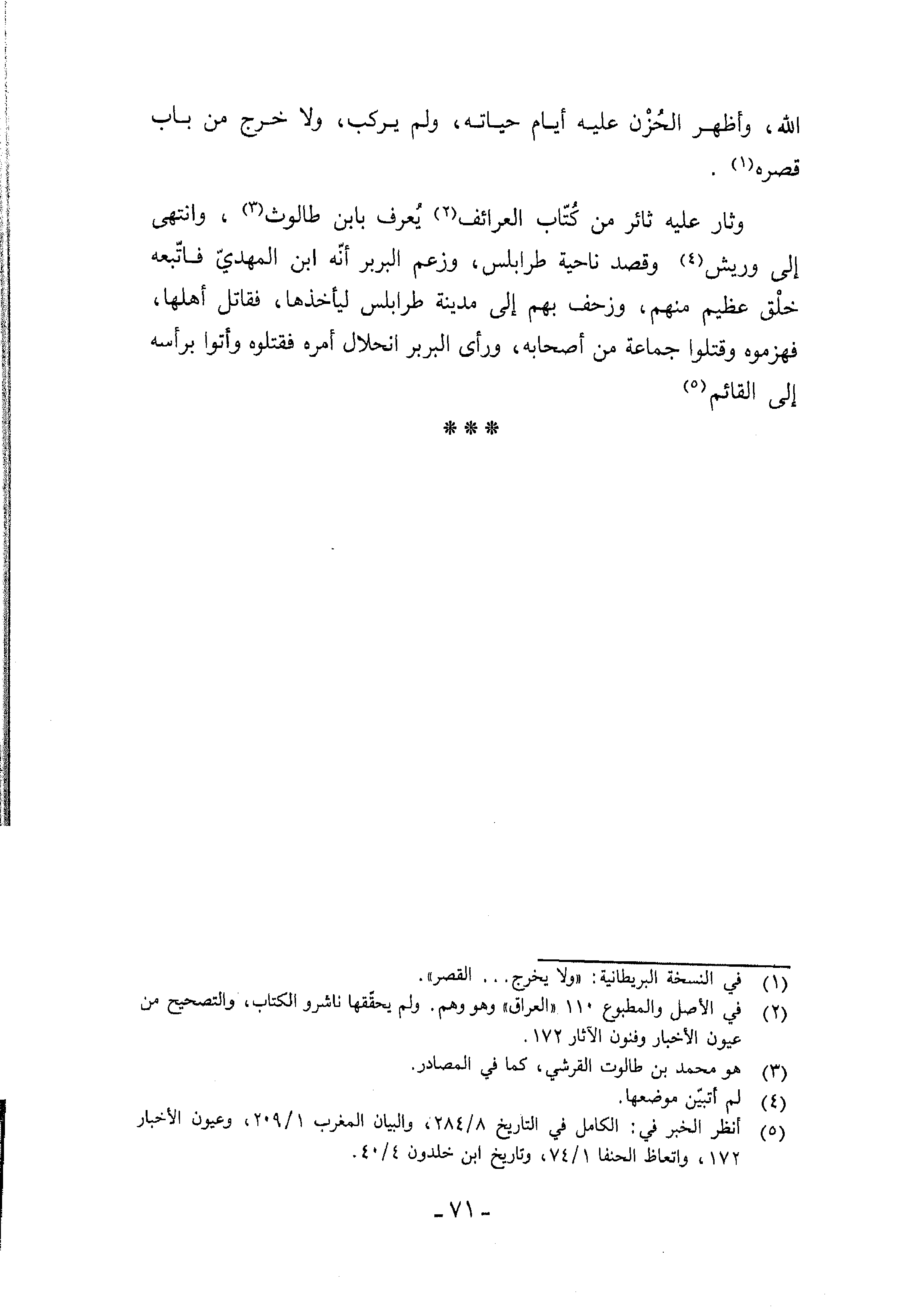 وثار عليه ثائر من كتّاب العرائف (¬2) يعرف بابن طالوث (¬3)، وانتهى إلى وريش (¬4) وقصد ناحية طرابلس، وزعم البربر أنّه ابن المهديّ فاتّبعه خلق عظيم منهم، وزحف بهم إلى مدينة طرابلس ليأخذها، فقاتل أهلها، فهزموه وقتلوا جماعة من أصحابه، ورأى البربر انحلال أمره فقتلوه وأتوا برأسه إلى القائم (¬5)