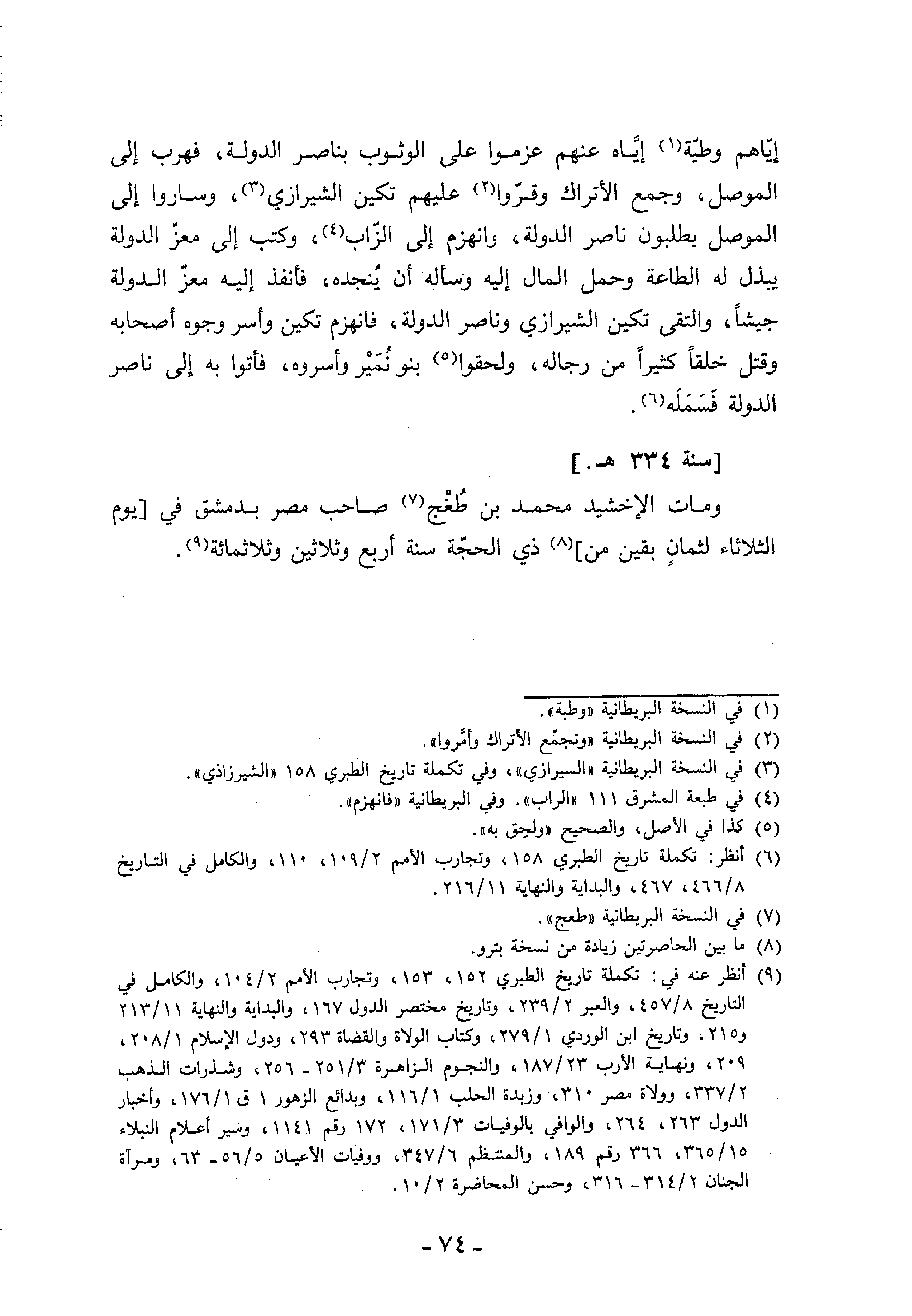 (¬6) أنظر: تكملة تاريخ الطبري 158، وتجارب الأمم 2/ 109،110، والكامل في التاريخ 8/ 466،467، والبداية والنهاية 11/ 216.