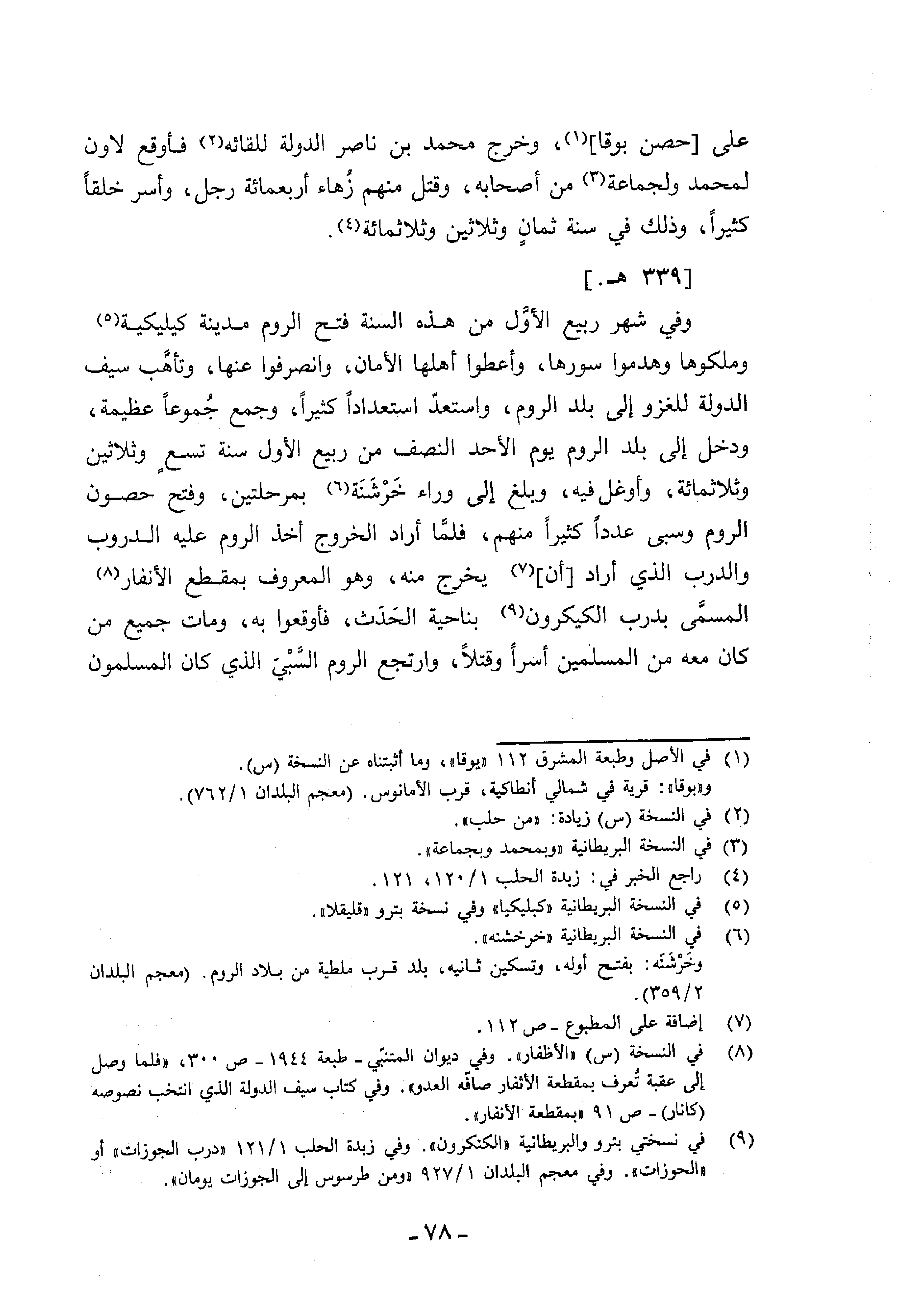 وفي شهر ربيع الأوّل من هذه السنة فتح الروم مدينة كيليكية (¬5) وملكوها وهدموا سورها، وأعطوا أهلها الأمان، وانصرفوا عنها، وتأهّب سيف الدولة للغزو إلى بلد الروم، واستعدّ استعدادا كثيرا، وجمع جموعا عظيمة، ودخل إلى بلد الروم يوم الأحد النصف من ربيع الأول سنة تسع وثلاثين وثلاثمائة، وأوغل فيه، وبلغ إلى وراء خرشنة (¬6) بمرحلتين، وفتح حصون الروم وسبى عددا كثيرا منهم، فلمّا أراد الخروج أخذ الروم عليه الدروب والدرب الذي أراد [أن] (¬7) يخرج منه، وهو المعروف بمقطع الأنفار (¬8) المسمّى بدرب الكيكرون (¬9) بناحية الحدث، فأوقعوا به، ومات جميع من كان معه من المسلمين أسرا وقتلا، وارتجع الروم السّبي الذي كان المسلمون