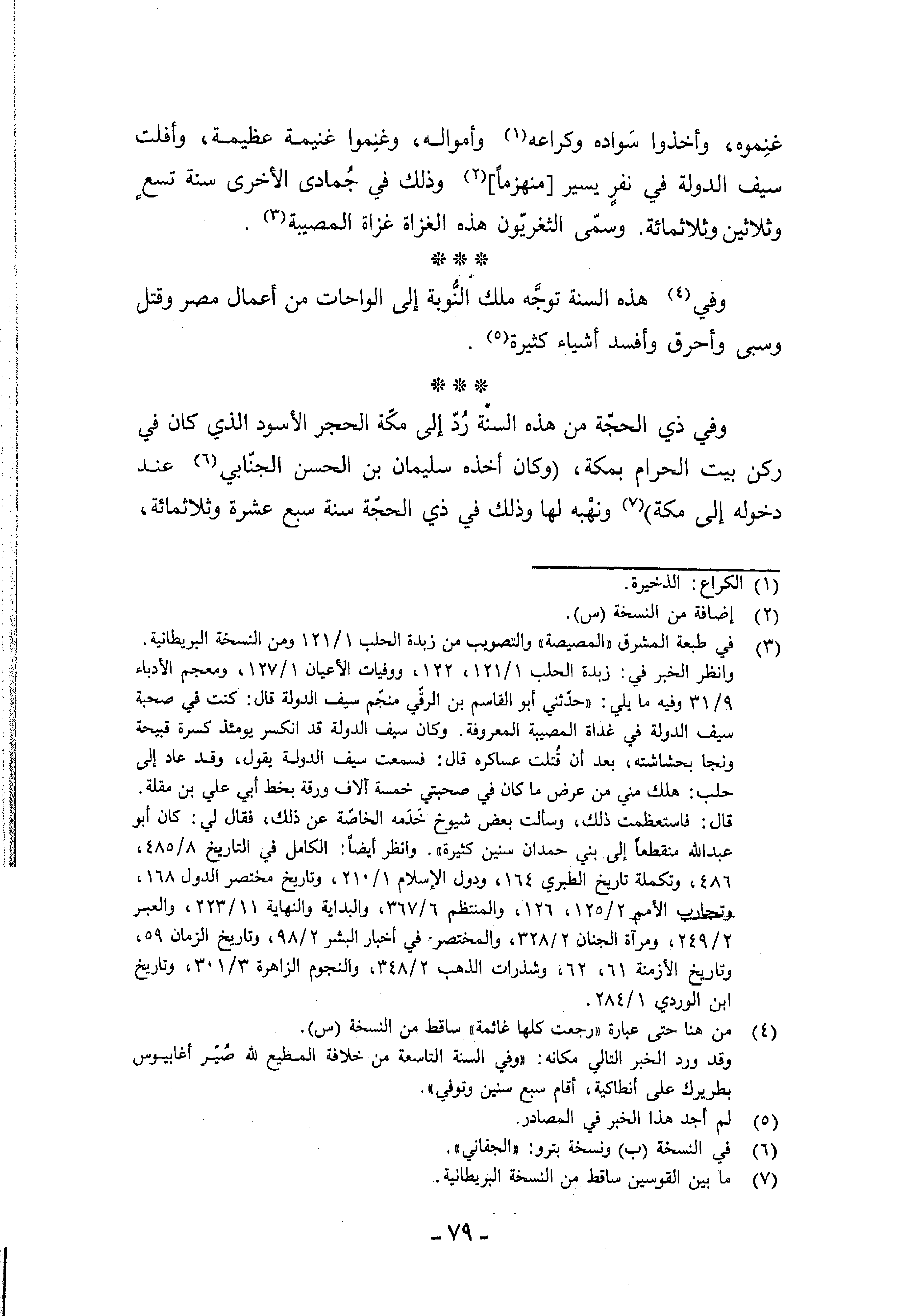 (¬3) في طبعة المشرق «المصيصة» والتصويب من زبدة الحلب 1/ 121 ومن النسخة البريطانية. وانظر الخبر في: زبدة الحلب 1/ 121،122، ووفيات الأعيان 1/ 127، ومعجم الأدباء 9/ 31 وفيه ما يلي: «حدّثني أبو القاسم بن الرقّي منجّم سيف الدولة قال: كنت في صحبة سيف الدولة في غداة المصيبة المعروفة. وكان سيف الدولة قد انكسر يومئذ كسرة قبيحة ونجا بحشاشته، بعد أن قتلت عساكره قال: فسمعت سيف الدولة يقول، وقد عاد إلى حلب: هلك مني من عرض ما كان في صحبتي خمسة آلاف ورقة بخط أبي علي بن مقلة. قال: فاستعظمت ذلك، وسألت بعض شيوخ خدمه الخاصّة عن ذلك، فقال لي: كان أبو عبد الله منقطعا إلى بني حمدان سنين كثيرة». وانظر أيضا: الكامل في التاريخ 8/ 485، 486، وتكملة تاريخ الطبري 164، ودول الإسلام 1/ 210، وتاريخ مختصر الدول 168، وتجارب الأمم 2/ 125،126، والمنتظم 6/ 367، والبداية والنهاية 11/ 223، والعبر 2/ 249، ومرآة الجنان 2/ 328، والمختصر في أخبار البشر 2/ 98، وتاريخ الزمان 59، وتاريخ الأزمنة 61،62، وشذرات الذهب 2/ 348، والنجوم الزاهرة 3/ 301، وتاريخ ابن الوردي 1/ 284.