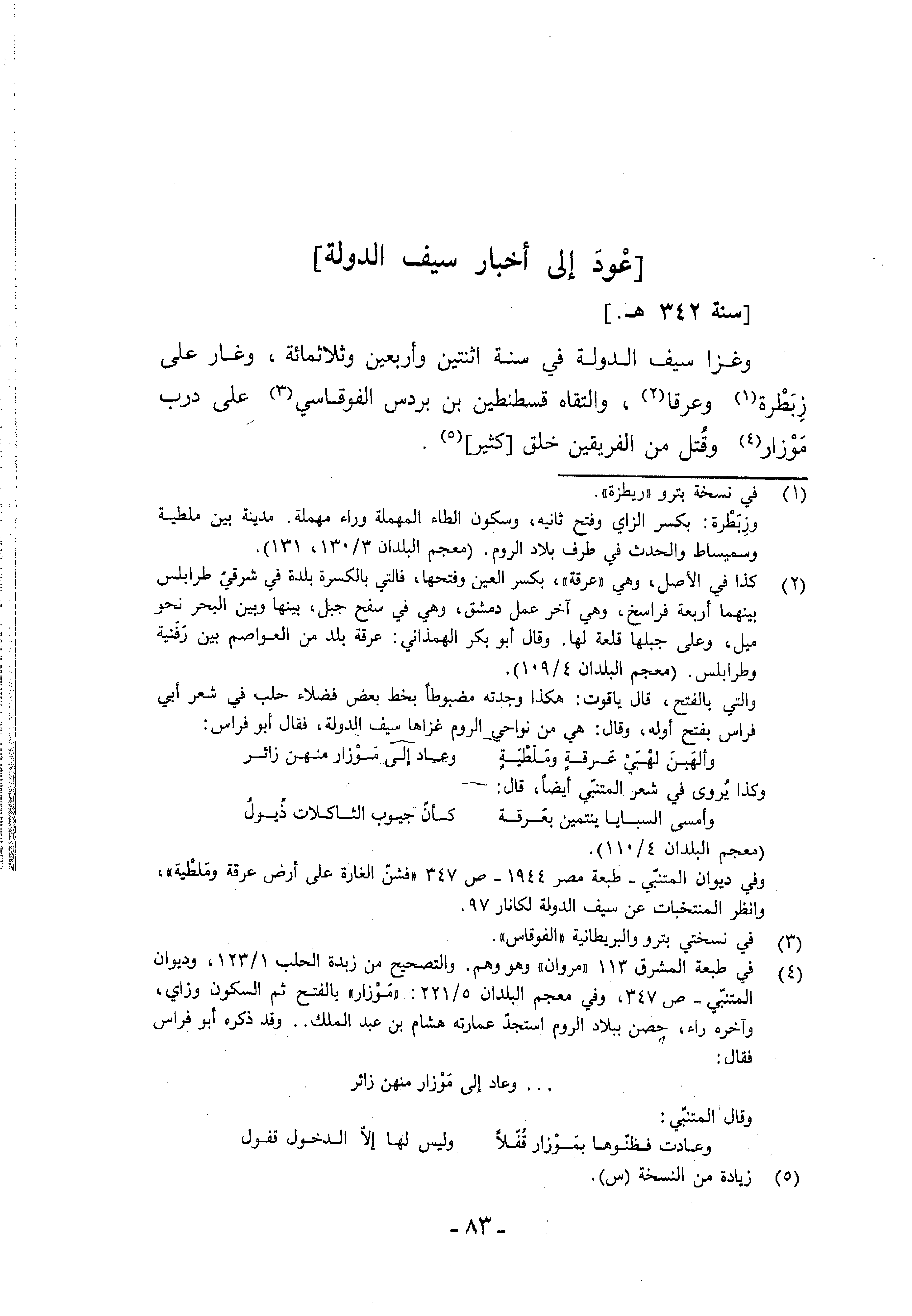 وغزا سيف الدولة في سنة اثنتين وأربعين وثلاثمائة، وغار على زبطرة (¬1) وعرقا (¬2)، والتقاه قسطنطين بن بردس الفوقاسي (¬3) على درب موزار (¬4) وقتل من الفريقين خلق [كثير] (¬5).