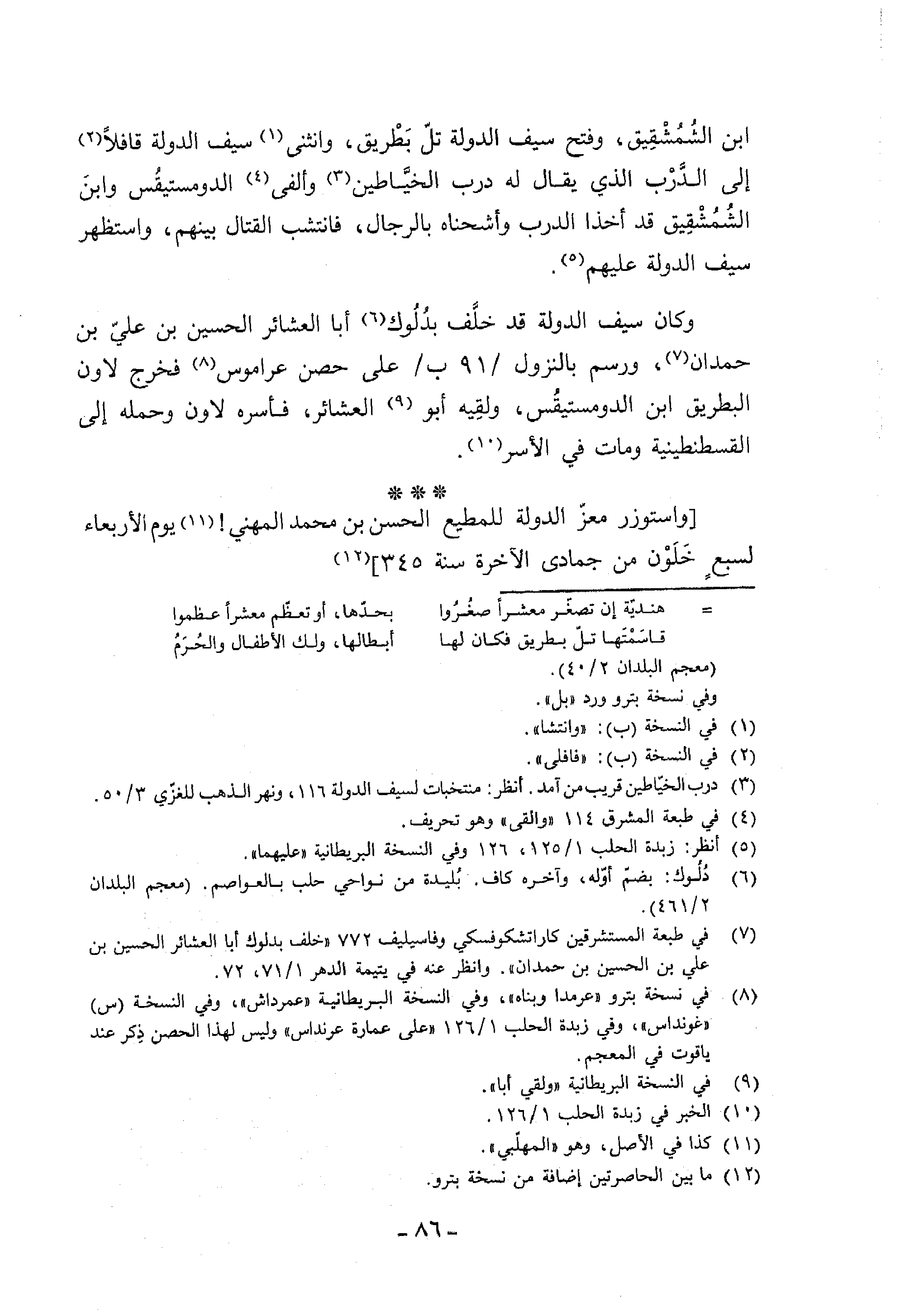 (¬7) في طبعة المستشرقين كاراتشكوفسكي وفاسيليف 772 «خلف بدلوك أبا العشائر الحسين بن علي بن الحسين بن حمدان». وانظر عنه في يتيمة الدهر 1/ 71،72.