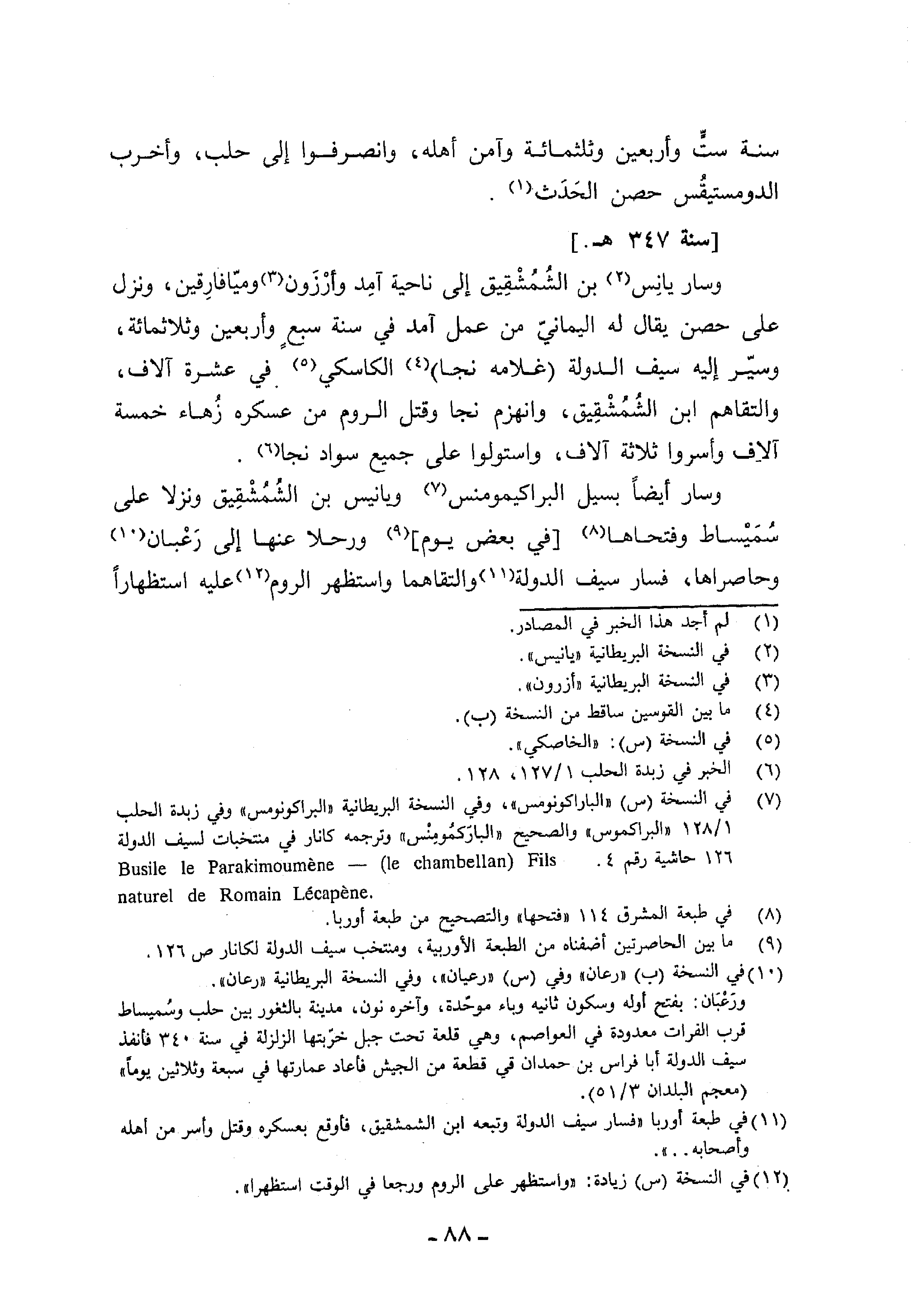 (¬7) في النسخة (س) «الباراكونومس»، وفي النسخة البريطانية «البراكونومس» وفي زبدة الحلب 1/ 128 «البراكموس» والصحيح «الباركمومنس» وترجمه كانار في منتخبات لسيف الدولة 126 حاشية رقم naturel de Romain Le?cape?ne . Busile le Parakimoume?ne- (le chambellan)Fils .4