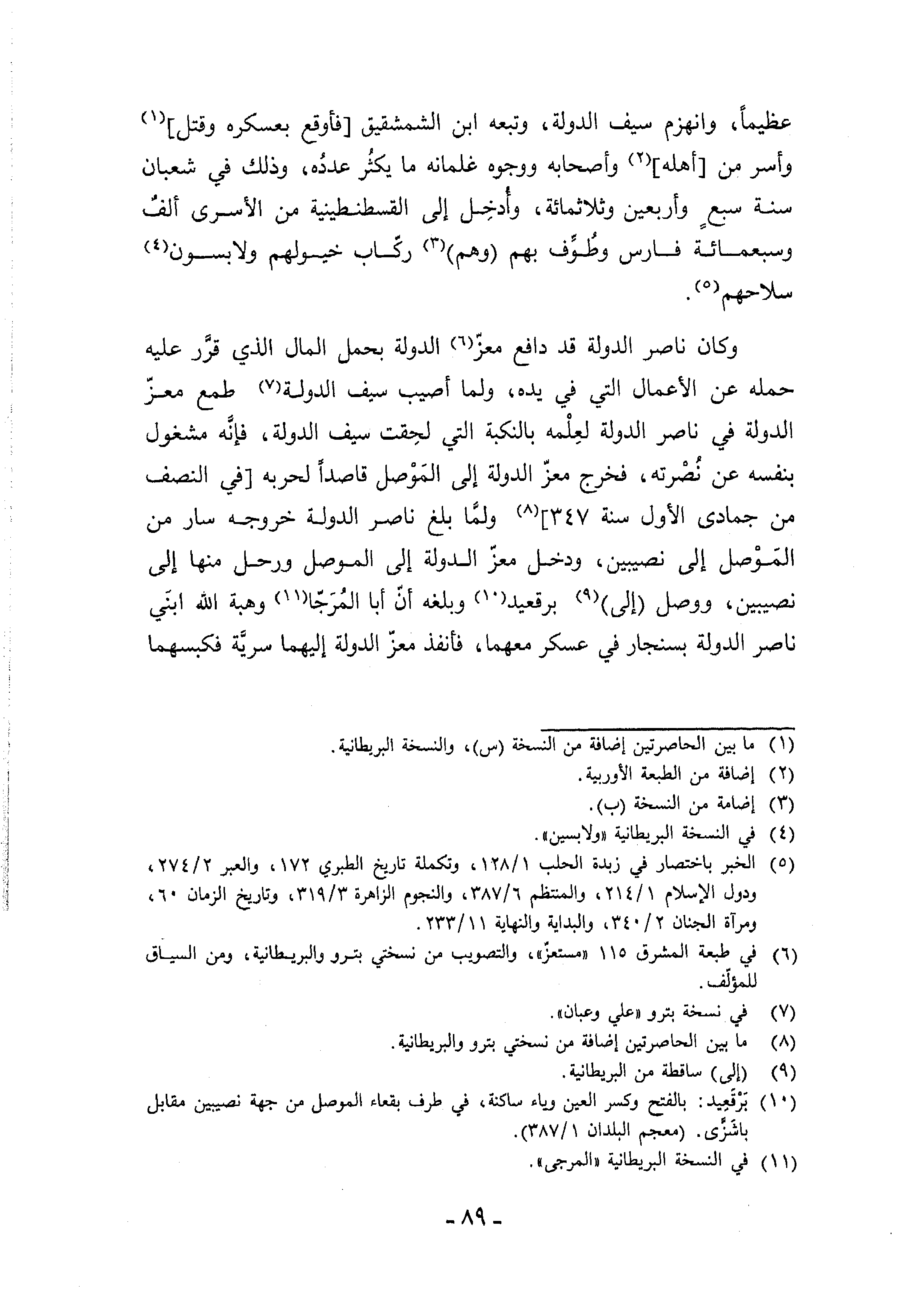 عظيما، وانهزم سيف الدولة، وتبعه ابن الشمشقيق [فأوقع بعسكره وقتل] (¬1) وأسر من [أهله] (¬2) وأصحابه ووجوه غلمانه ما يكثر عدده، وذلك في شعبان سنة سبع وأربعين وثلاثمائة، وأدخل إلى القسطنطينية من الأسرى ألف وسبعمائة فارس وطوّف بهم (وهم) (¬3) ركّاب خيولهم ولابسون (¬4) سلاحهم (¬5).