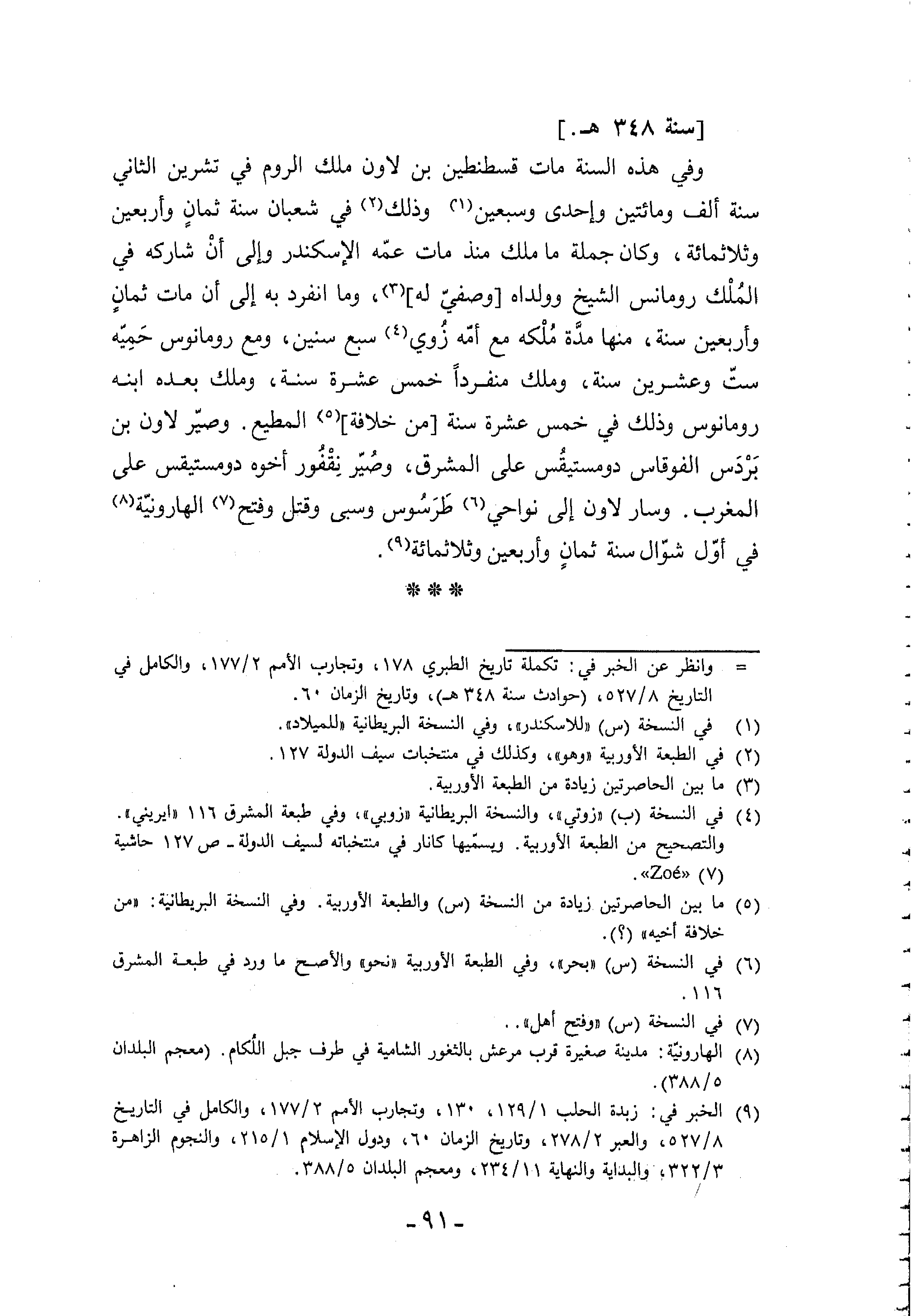 (¬4) في النسخة (ب) «زوتي»، والنسخة البريطانية «زوبي»، وفي طبعة المشرق 116 «ايريني». والتصحيح من الطبعة الأوربية. ويسمّيها كانار في منتخباته لسيف الدولة-ص 127 حاشية. «Zoe ?» (7)