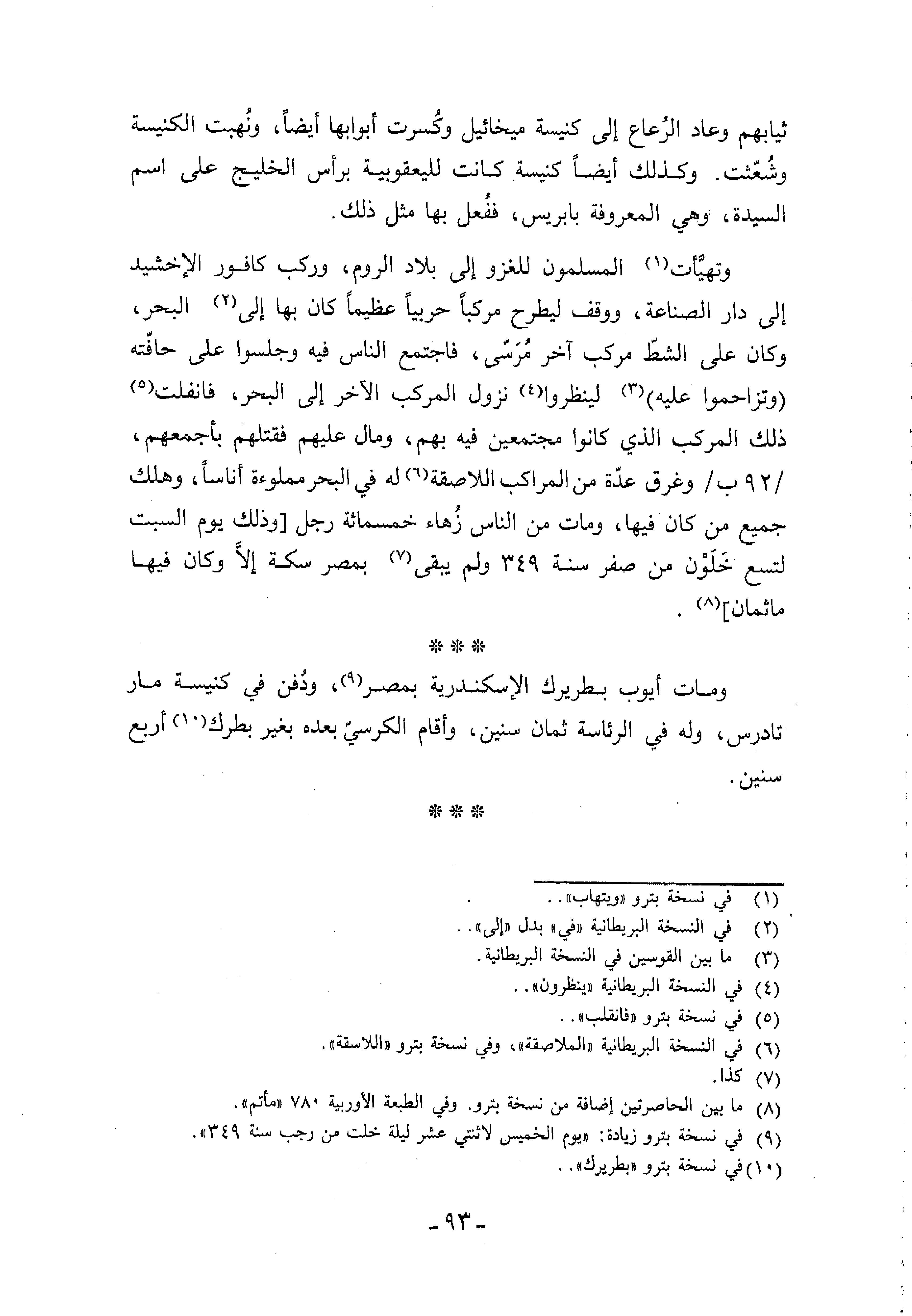 وتهيّأت (¬1) المسلمون للغزو إلى بلاد الروم، وركب كافور الإخشيد إلى دار الصناعة، ووقف ليطرح مركبا حربيا عظيما كان بها إلى (¬2) البحر، وكان على الشطّ مركب آخر مرسّى، فاجتمع الناس فيه وجلسوا على حافّته (وتزاحموا عليه) (¬3) لينظروا (¬4) نزول المركب الآخر إلى البحر، فانفلت (¬5) ذلك المركب الذي كانوا مجتمعين فيه بهم، ومال عليهم فقتلهم بأجمعهم، /92 ب/وغرق عدّة من المراكب اللاصقة (¬6) له في البحر مملوءة أناسا، وهلك جميع من كان فيها، ومات من الناس زهاء خمسمائة رجل [وذلك يوم السبت لتسع خلون من صفر سنة 349 ولم يبقى (¬7) بمصر سكة إلاّ وكان فيها ماثمان] (¬8).