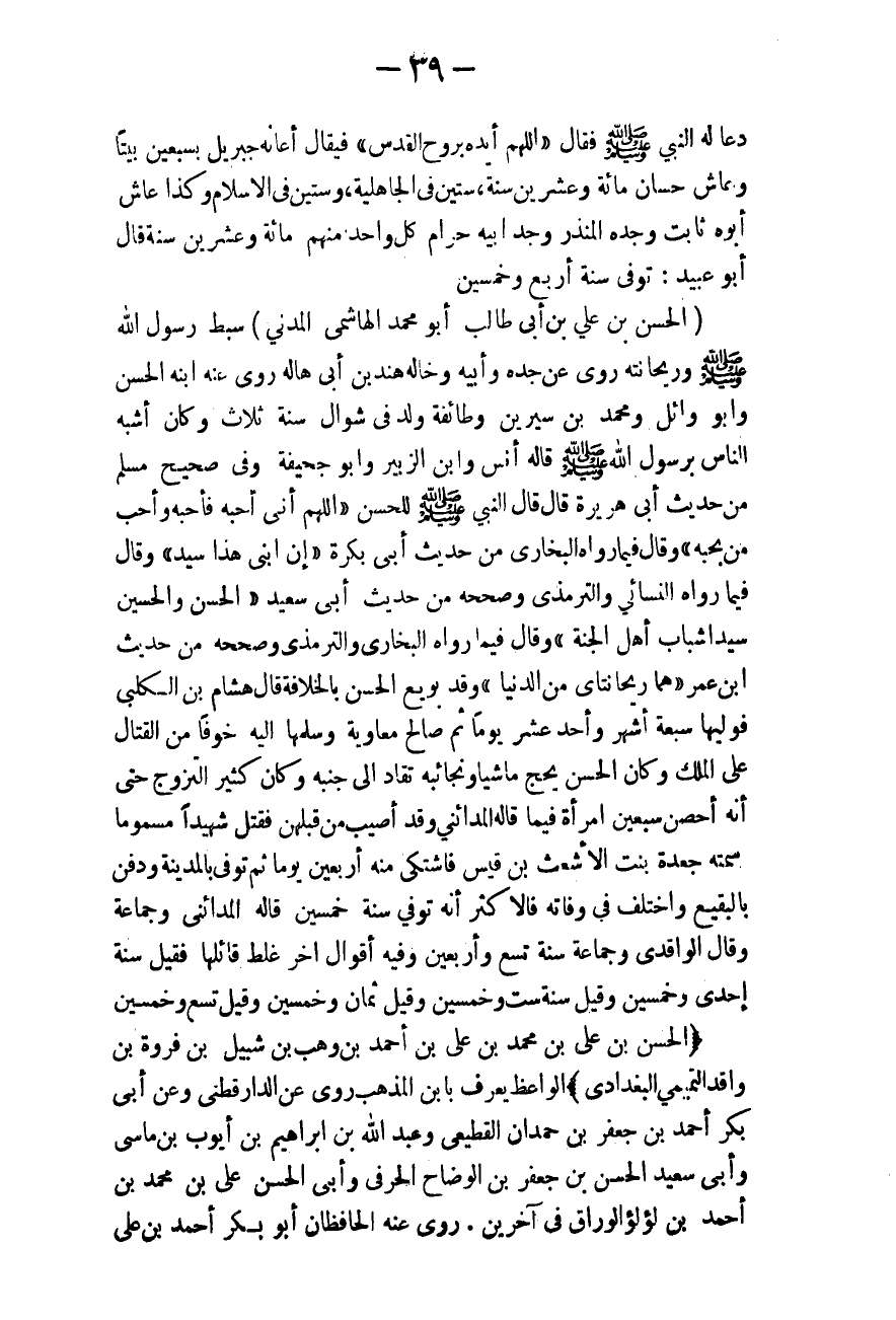 (الْحَسَنُ بْنُ عَلِيِّ بْنِ أَبِي طَالِبٍ أَبُو مُحَمَّدٍ الْهَاشِمِيُّ الْمَدَنِيُّ) سِبْطُ رَسُولِ اللَّهِ - صَلَّى اللَّهُ عَلَيْهِ وَسَلَّمَ - وَرَيْحَانَتُهُ رَوَى عَنْ جَدِّهِ وَأَبِيهِ وَخَالِهِ هِنْدِ بْنِ أَبِي هَالَةَ رَوَى عَنْهُ ابْنُهُ الْحَسَنُ وَأَبُو وَائِلٍ وَمُحَمَّدُ بْنُ سِيرِينَ وَطَائِفَةٌ وُلِدَ فِي شَوَّالٍ سَنَةَ ثَلَاثٍ، وَكَانَ أَشْبَهَ النَّاسِ بِرَسُولِ اللَّهِ - صَلَّى اللَّهُ عَلَيْهِ وَسَلَّمَ - قَالَهُ أَنَسٌ وَابْنُ الزُّبَيْرِ وَأَبُو جُحَيْفَةَ وَفِي صَحِيحِ مُسْلِمٍ مِنْ حَدِيثِ أَبِي هُرَيْرَةَ قَالَ «قَالَ النَّبِيُّ - صَلَّى اللَّهُ عَلَيْهِ وَسَلَّمَ - لِلْحَسَنِ اللَّهُمَّ إنِّي أُحِبُّهُ فَأَحِبَّهُ وَأَحِبَّ مَنْ يُحِبُّهُ» . وَقَالَ فِيمَا رَوَاهُ الْبُخَارِيُّ مِنْ حَدِيثِ أَبِي بَكْرَةَ «إنَّ ابْنِي هَذَا سَيِّدٌ» وَقَالَ فِيمَا رَوَاهُ النَّسَائِيّ وَالتِّرْمِذِيُّ وَصَحَّحَهُ مِنْ حَدِيثِ أَبِي سَعِيدٍ «الْحَسَنُ وَالْحُسَيْنُ سَيِّدَا شَبَابِ أَهْلِ الْجَنَّةِ» وَقَالَ فِيمَا رَوَاهُ الْبُخَارِيُّ وَالتِّرْمِذِيُّ وَصَحَّحَهُ مِنْ حَدِيثِ ابْنِ عُمَرَ «هُمَا رَيْحَانَتَايَ مِنْ الدُّنْيَا» وَقَدْ بُويِعَ الْحَسَنُ بِالْخِلَافَةِ قَالَ هِشَامُ بْنُ الْكَلْبِيِّ فَوَلِيَهَا سَبْعَةَ أَشْهُرٍ وَأَحَدَ عَشَرَ يَوْمًا، ثُمَّ صَالَحَ مُعَاوِيَةَ وَسَلَّمَهَا إلَيْهِ خَوْفًا مِنْ الْقِتَالِ عَلَى الْمُلْكِ. وَكَانَ الْحَسَنُ يَحُجُّ مَاشِيًا وَنَجَائِبُهُ تُقَادُ إلَى جَنْبِهِ، وَكَانَ كَثِيرَ التَّزَوُّجِ حَتَّى أَنَّهُ أَحْصَنَ سَبْعِينَ امْرَأَةً فِيمَا قَالَهُ الْمَدَائِنِيُّ، وَقَدْ أُصِيبَ مِنْ قِبَلِهِنَّ فَقُتِلَ شَهِيدًا مَسْمُومًا سَمَّتْهُ جَعْدَةُ بِنْتُ الْأَشْعَثِ بْنِ قَيْسٍ فَاشْتَكَى مِنْهُ أَرْبَعِينَ يَوْمًا، ثُمَّ تُوُفِّيَ بِالْمَدِينَةِ وَدُفِنَ بِالْبَقِيعِ وَاخْتُلِفَ فِي وَفَاتِهِ، فَالْأَكْثَرُ أَنَّهُ تُوُفِّيَ سَنَةَ خَمْسِينَ قَالَهُ الْمَدَائِنِيُّ وَجَمَاعَةٌ. وَقَالَ الْوَاقِدِيُّ وَجَمَاعَةٌ: سَنَةَ تِسْعٍ وَأَرْبَعِينَ وَفِيهِ أَقْوَالٌ أُخَرُ غَلِطَ قَائِلُهَا فَقِيلَ: سَنَةَ إحْدَى وَخَمْسِينَ وَقِيلَ سَنَةَ سِتٍّ وَخَمْسِينَ، وَقِيلَ ثَمَانٍ وَخَمْسِينَ وَقِيلَ تِسْعٍ وَخَمْسِينَ.