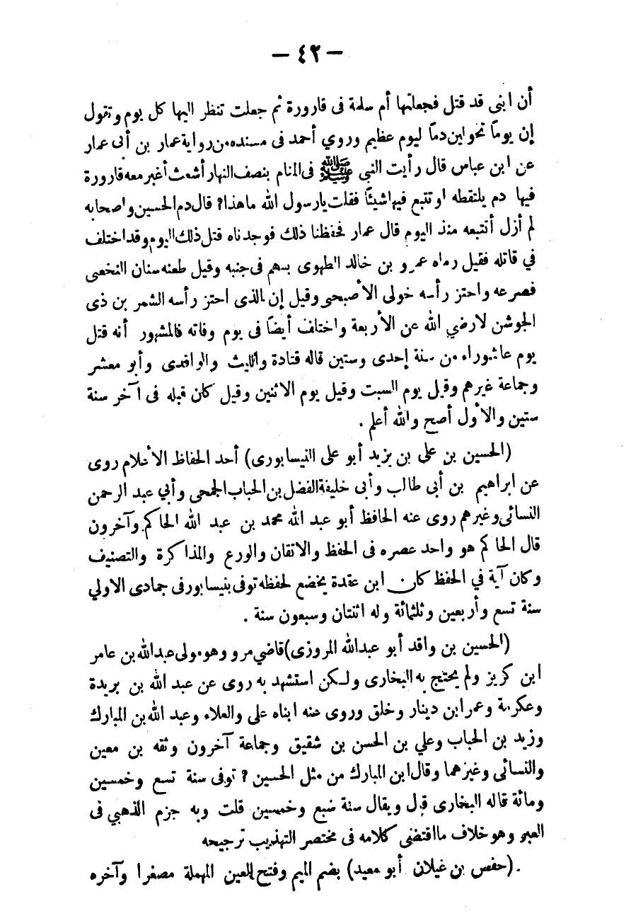ـــــــــــــــــــــــــــــQأَنَّ ابْنِي قَدْ قُتِلَ فَجَعَلْتهَا أُمُّ سَلَمَةَ فِي قَارُورَةٍ، ثُمَّ جَعَلَتْ تَنْظُرُ إلَيْهَا كُلَّ يَوْمٍ وَتَقُولُ إنَّ يَوْمًا تُحَوَّلِينَ دَمًا لَيَوْمٌ عَظِيمٌ» . وَرَوَى أَحْمَدُ فِي مُسْنَدِهِ مِنْ رِوَايَةِ عَمَّارِ بْنِ أَبِي عَمَّارٍ عَنْ ابْنِ عَبَّاسٍ قَالَ «رَأَيْت النَّبِيَّ - صَلَّى اللَّهُ عَلَيْهِ وَسَلَّمَ - فِي الْمَنَامِ بِنِصْفِ النَّهَارِ أَشْعَثَ أَغْبَرَ مَعَهُ قَارُورَةٌ فِيهَا دَمٌ يَلْتَقِطُهُ أَوْ تَتَبَّعَ فِيهَا شَيْئًا فَقُلْت: يَا رَسُولَ اللَّهِ مَا هَذَا؟ قَالَ دَمُ الْحُسَيْنِ وَأَصْحَابِهِ لَمْ أَزَلْ أَتَتَبَّعُهُ مُنْذُ الْيَوْمِ. قَالَ عَمَّارٌ فَحَفِظْنَا ذَلِكَ فَوَجَدْنَاهُ قُتِلَ ذَلِكَ الْيَوْمَ» . وَقَدْ اُخْتُلِفَ فِي قَاتِلِهِ فَقِيلَ رَمَاهُ عَمْرُو بْنُ خَالِدٍ الطُّهْوِيُّ بِسَهْمٍ فِي جَنْبِهِ، وَقِيلَ طَعَنَهُ سِنَانٌ النَّخَعِيّ فَصَرَعَهُ، وَاحْتَزَّ رَأْسَهُ خَوْلِيٌّ الْأَصْبَحِيُّ وَقِيلَ إنَّ الَّذِي احْتَزَّ رَأْسَهُ الشَّمِرُ بْنُ ذِي الْجَوْشَنِ لَا رَضِيَ اللَّهُ عَنْ الْأَرْبَعَةِ، وَاخْتُلِفَ أَيْضًا فِي يَوْمِ وَفَاتِهِ فَالْمَشْهُورُ أَنَّهُ قُتِلَ يَوْمَ عَاشُورَاءَ مِنْ سَنَةِ إحْدَى وَسِتِّينَ قَالَهُ قَتَادَةُ وَاللَّيْثُ وَالْوَاقِدِيُّ وَأَبُو مَعْشَرٍ وَجَمَاعَةٌ غَيْرُهُمْ وَقِيلَ يَوْمَ السَّبْتِ، وَقِيلَ يَوْمَ الِاثْنَيْنِ وَقِيلَ كَانَ قَبْلَهُ فِي آخِرِ سَنَةٍ سِتِّينَ، وَالْأَوَّلُ أَصَحُّ وَاَللَّهُ أَعْلَمُ.