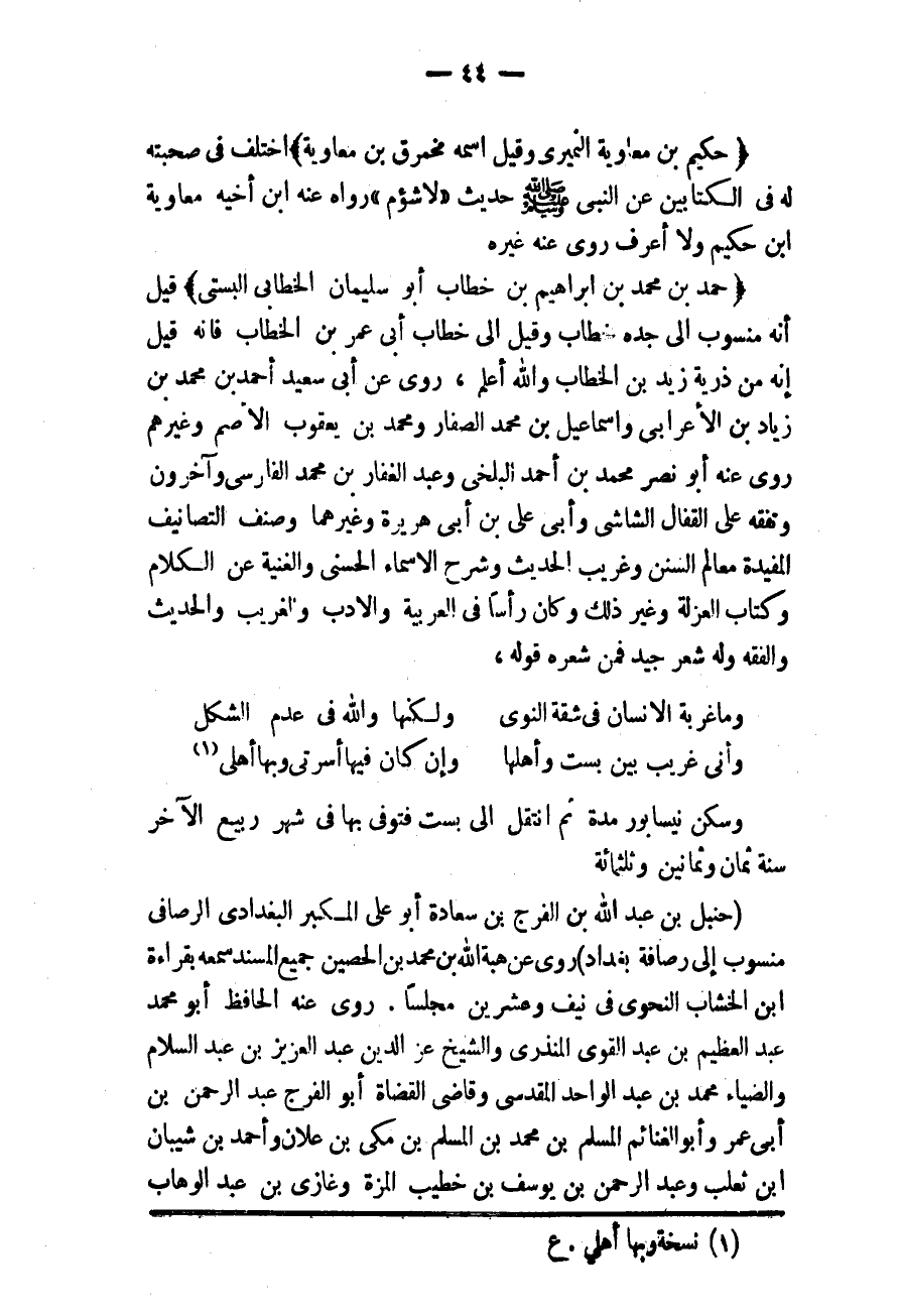 أَحْمَدَ بْنَ مُحَمَّدِ بْنِ إبْرَاهِيمَ بْنِ خَطَّابٍ أَبُو سُلَيْمَانَ الْخَطَّابِيُّ الْبُسْتِيُّ قِيلَ إنَّهُ مَنْسُوبٌ إلَى جَدِّهِ خَطَّابٍ، وَقِيلَ إلَى خَطَّابٍ أَبِي عُمَرَ بْنِ الْخَطَّابِ فَإِنَّهُ قِيلَ إنَّهُ مِنْ ذُرِّيَّةِ زَيْدِ بْنِ الْخَطَّابِ وَاَللَّهُ أَعْلَمُ. رَوَى عَنْ أَبِي سَعِيدٍ أَحْمَدَ بْنِ مُحَمَّدِ بْنِ زِيَادِ بْنِ الْأَعْرَابِيِّ وَإِسْمَاعِيلَ بْنِ مُحَمَّدٍ الصَّفَّارُ وَمُحَمَّدِ بْنِ يَعْقُوبَ الْأَصَمِّ وَغَيْرِهِمْ رَوَى عَنْهُ أَبُو نَصْرٍ مُحَمَّدُ بْنُ أَحْمَدَ الْبَلْخِيّ وَعَبْدُ الْغَفَّارِ بْنُ مُحَمَّدٍ الْفَارِسِيُّ وَآخَرُونَ وَتَفَقَّهَ عَلَى الْقَفَّالِ الشَّاشِيِّ وَأَبِي عَلِيِّ بْنِ أَبِي هُرَيْرَةَ وَغَيْرِهِمَا، وَصَنَّفَ التَّصَانِيفَ الْمُفِيدَةَ مَعَالِمَ السُّنَنِ وَغَرِيبَ الْحَدِيثِ وَشَرْحَ الْأَسْمَاءِ الْحُسْنَى، وَالْغُنْيَةَ عَنْ الْكَلَامِ وَكِتَابَ الْعُزْلَةِ وَغَيْرَ ذَلِكَ، وَكَانَ رَأْسًا فِي الْعَرَبِيَّةِ وَالْأَدَبِ وَالْغَرِيبِ وَالْحَدِيثِ وَالْفِقْهِ وَلَهُ شِعْرٌ جَيِّدٌ فَمِنْ شِعْرِهِ قَوْلُهُ