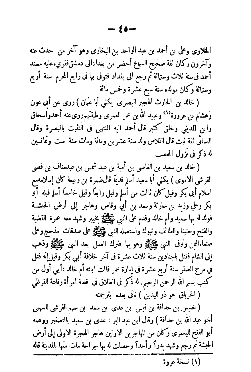(خَالِدُ بْنُ سَعِيدِ بْنِ الْعَاصِ بْنِ أُمَيَّةَ بْنِ عَبْدِ شَمْسِ بْنِ عَبْدِ مَنَافِ بْنِ قُصَيٍّ الْقُرَشِيُّ الْأُمَوِيُّ) يُكَنَّى أَبَا سَعِيدٍ أَسْلَمَ قَدِيمًا قَالَ ضَمْرَةُ بْنُ رَبِيعَةَ كَانَ إسْلَامُهُ مَعَ إسْلَامِ أَبِي بَكْرٍ وَقِيلَ كَانَ ثَالِثَ مَنْ أَسْلَمَ وَقِيلَ رَابِعًا وَقِيلَ خَامِسًا، أَسْلَمَ قَبْلَهُ أَبُو بَكْرٍ وَعَلِيٌّ وَزَيْدُ بْنُ حَارِثَةَ وَسَعْدُ بْنُ أَبِي وَقَّاصٍ وَهَاجَرَ إلَى أَرْضِ الْحَبَشَةِ فَوُلِدَ لَهُ بِهَا سَعِيدٌ وَأُمُّ خَالِدٍ وَقَدِمَ عَلَى النَّبِيِّ - صَلَّى اللَّهُ عَلَيْهِ وَسَلَّمَ - بِخَيْبَرَ، وَشَهِدَ مَعَهُ عُمْرَةَ الْقَضِيَّةَ وَالْفَتْحَ وَحُنَيْنًا وَالطَّائِفَ وَتَبُوكَ وَاسْتَعْمَلَهُ النَّبِيُّ - صَلَّى اللَّهُ عَلَيْهِ وَسَلَّمَ - عَلَى صَدَقَاتِ مَذْحِجٍ وَعَلَى صَنْعَاءِ الْيَمَنِ وَتُوُفِّيَ النَّبِيُّ - صَلَّى اللَّهُ عَلَيْهِ وَسَلَّمَ - وَهُوَ بِهَا فَتَرَكَ الْعَمَلَ بَعْدَ النَّبِيِّ - صَلَّى اللَّهُ عَلَيْهِ وَسَلَّمَ -، وَذَهَبَ إلَى الشَّامِ فَقُتِلَ بِأَجْنَادِينَ سَنَةَ ثَلَاثَ عَشْرَةَ فِي آخِرِ خِلَافَةِ أَبِي بَكْرٍ، وَقِيلَ: إنَّهُ قُتِلَ فِي مَرْجِ الصُّفَّرِ سَنَةَ أَرْبَعَ عَشْرَةَ فِي إمَارَةِ عُمَرَ قَالَتْ ابْنَتُهُ أُمُّ خَالِدٍ: أَبِي أَوَّلُ مَنْ كُتِبَ بِسْمِ اللَّهِ الرَّحْمَنِ الرَّحِيمِ لَهُ ذِكْرٌ فِي الطَّلَاقِ فِي قِصَّةِ امْرَأَةِ رِفَاعَةَ الْقُرَظِيِّ.