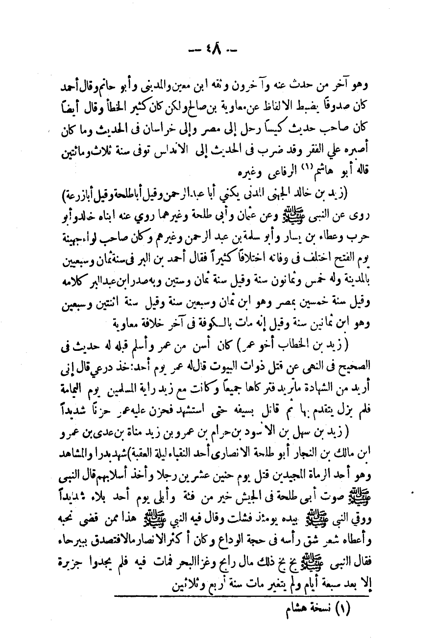 (زَيْدُ بْنُ خَالِدٍ الْجُهَنِيِّ الْمَدَنِيُّ يُكَنَّى أَبَا عَبْدِ الرَّحْمَنِ وَقِيلَ أَبَا طَلْحَةَ وَقِيلَ أَبَا زُرْعَةَ) رَوَى عَنْ النَّبِيِّ - صَلَّى اللَّهُ عَلَيْهِ وَسَلَّمَ - وَعَنْ عُثْمَانَ وَأَبِي طَلْحَةَ وَغَيْرِهِمَا، رَوَى عَنْهُ ابْنَاهُ خَالِدٌ وَأَبُو حَرْبٍ وَعَطَاءُ بْنُ يَسَارٍ وَأَبُو سَلَمَةَ بْنُ عَبْدِ الرَّحْمَنِ وَغَيْرُهُمْ، وَكَانَ صَاحِبَ لِوَاءِ جُهَيْنَةَ يَوْمَ الْفَتْحِ، اُخْتُلِفَ فِي وَفَاتِهِ اخْتِلَافًا كَثِيرًا فَقَالَ ابْنُ عَبْدِ الْبَرِّ فِي سَنَةِ ثَمَانٍ وَسَبْعِينَ بِالْمَدِينَةِ وَلَهُ خَمْسٌ وَثَمَانُونَ سَنَةً وَقِيلَ سَنَةَ ثَمَانٍ وَسِتِّينَ، وَبِهِ صَدَّرَ ابْنُ عَبْدِ الْبَرِّ كَلَامَهُ، وَقِيلَ سَنَةَ خَمْسِينَ بِمِصْرَ وَهُوَ ابْنُ ثَمَانٍ وَسَبْعِينَ سَنَةً وَقِيلَ سَنَةَ اثْنَتَيْنِ وَسَبْعِينَ، وَهُوَ ابْنُ ثَمَانِينَ سَنَةً، وَقِيلَ إنَّهُ مَاتَ بِالْكُوفَةِ فِي آخِرِ خِلَافَةِ مُعَاوِيَةَ.