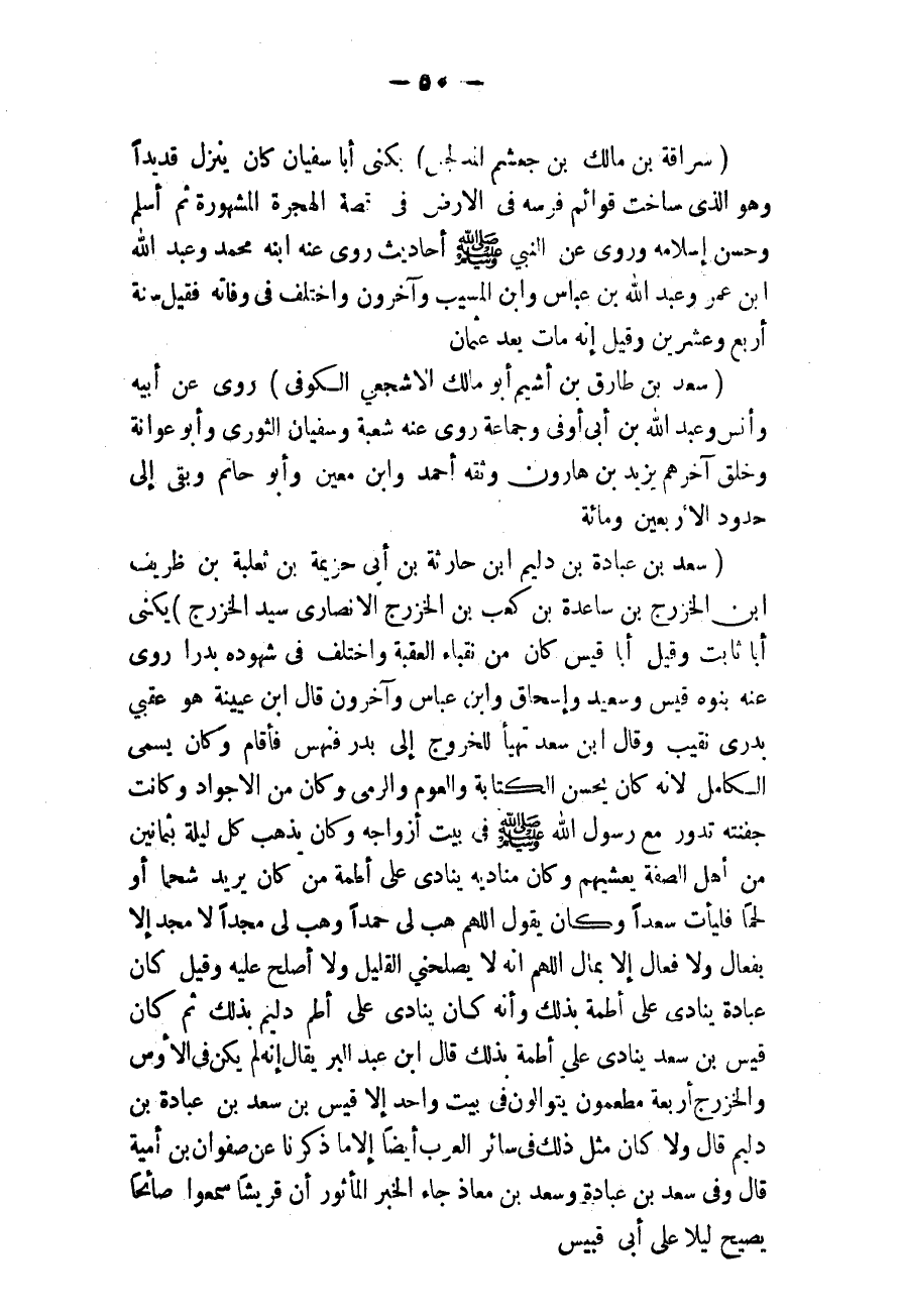(سَعْدُ بْنُ عُبَادَةَ بْنِ دُلَيْمِ بْنِ حَارِثَةَ بْنِ أَبِي خُزَيْمَةَ بْنِ ثَعْلَبَةَ بْنِ ظَرِيفِ بْنِ الْخَزْرَجِ بْنِ سَاعِدَةَ بْنِ كَعْبِ بْنِ الْخَزْرَجِ الْأَنْصَارِيُّ سَيِّدُ الْخَزْرَجِ) يُكَنَّى أَبَا ثَابِتٍ وَقِيلَ أَبَا قَيْسٍ كَانَ مِنْ نُقَبَاءِ الْعَقَبَةِ وَاخْتُلِفَ فِي شُهُودِهِ بَدْرًا رَوَى عَنْهُ بَنُوهُ قَيْسٌ وَسَعِيدٍ وَإِسْحَاقُ وَابْنُ عَبَّاسٍ وَآخَرُونَ قَالَ ابْنُ عُيَيْنَةَ هُوَ عَقَبِيٌّ بَدْرِيٌّ نَقِيبٌ. وَقَالَ ابْنُ سَعْدٍ: تَهَيَّأَ لِلْخُرُوجِ إلَى بَدْرٍ فَنَهَسَ فَأَقَامَ، وَكَانَ يُسَمَّى الْكَامِلَ؛ لِأَنَّهُ كَانَ يُحْسِنُ الْكِتَابَةَ وَالْعَوْمَ وَالرَّمْيَ، وَكَانَ مِنْ الْأَجْوَادِ، وَكَانَتْ جَفْنَتُهُ تَدُورُ مَعَ رَسُولِ اللَّهِ - صَلَّى اللَّهُ عَلَيْهِ وَسَلَّمَ - فِي بَيْتِ أَزْوَاجِهِ، وَكَانَ يَذْهَبُ كُلَّ لَيْلَةٍ بِثَمَانِينَ مِنْ أَهْلِ الصِّفَةِ يُعَشِّيهِمْ وَكَانَ مُنَادِيهِ يُنَادِي عَلَى أُطُمَةَ مَنْ كَانَ يُرِيدُ شَحْمًا أَوْ لَحْمًا فَلِيَأْتِ سَعْدًا وَكَانَ يَقُولُ اللَّهُمَّ هَبْ لِي حَمْدًا وَهَبَ لِي مَجْدًا لَا مَجْدَ إلَّا بِفِعَالٍ وَلَا فِعَالَ إلَّا بِمَالٍ اللَّهُمَّ إنَّهُ لَا يُصْلِحُنِي الْقَلِيلُ وَلَا أَصْلُحُ عَلَيْهِ. وَقِيلَ كَانَ عُبَادَةَ يُنَادِي عَلَى أُطُمَةٍ بِذَلِكَ وَأَنَّهُ كَانَ يُنَادِي عَلَى أُطُمِ دُلَيْمٍ بِذَلِكَ ثُمَّ كَانَ قَيْسُ بْنُ سَعْدٍ يُنَادِي عَلَى أُطُمَةٍ بِذَلِكَ. قَالَ ابْنُ عَبْدِ الْبَرِّ يُقَالُ إنَّهُ لَمْ يَكُنْ فِي الْأَوْسِ وَالْخَزْرَجِ أَرْبَعَةٌ مُطْعِمُونَ يَتَوَالَوْنَ فِي بَيْتٍ وَاحِدٍ إلَّا قَيْسَ بْنَ سَعْدِ بْنِ عُبَادَةَ بْنِ دُلَيْمٍ قَالَ وَلَا كَانَ مِثْلُ ذَلِكَ فِي سَائِرِ الْعَرَبِ أَيْضًا إلَّا مَا ذَكَرْنَا عَنْ صَفْوَانَ بْنِ أُمَيَّةَ، قَالَ: وَفِي سَعْدِ بْنِ عُبَادَةَ وَسَعْدِ بْنِ مُعَاذٍ جَاءَ الْخَبَرُ الْمَأْثُورُ أَنَّ قُرَيْشًا سَمِعُوا صَائِحًا يَصِيحُ لَيْلًا عَلَى أَبِي قُبَيْسٍ