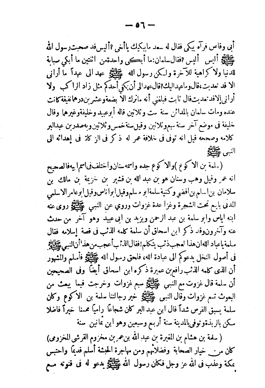 (سَلَمَةُ بْنُ الْأَكْوَعِ) وَالْأَكْوَعُ جَدُّهُ وَاسْمُهُ سِنَانٌ وَاخْتُلِفَ فِي اسْمِ أَبِيهِ فَالصَّحِيحُ أَنَّهُ عُمَرُ وَقِيلَ وَهْبٌ وَسِنَانٌ هُوَ ابْنُ عَبْدِ اللَّهِ بْنِ قُشَيْرِ بْنِ خُزَيْمَةَ بْنِ مَالِكِ بْنِ سَلَامَانِ بْنِ أَسْلَمَ بْنِ أَفْضِي وَكُنْيَةُ سَلَمَةَ أَبُو مُسْلِمٍ وَقِيلَ أَبُو أُنَاسٍ وَقِيلَ أَبُو عَامِرٍ الْأَسْلَمِيُّ الْمَدَنِيُّ بَايَعَ تَحْتَ الشَّجَرَةِ وَغَزَا عِدَّةَ غَزَوَاتٍ وَرَوَى عَنْ النَّبِيِّ - صَلَّى اللَّهُ عَلَيْهِ وَسَلَّمَ - رَوَى عَنْهُ ابْنُهُ إيَاسٌ وَأَبُو سَلَمَةَ بْنُ عَبْدِ الرَّحْمَنِ وَيَزِيدُ بْنُ أَبِي عُبَيْدٍ، وَهُوَ آخِرُ مَنْ حَدَّثَ عَنْهُ وَآخَرُونَ. وَقَدْ ذَكَرَ ابْنُ إِسْحَاقَ أَنَّ سَلَمَةَ كَلَّمَهُ الذِّئْبُ فِي قِصَّةِ إسْلَامِهِ فَقَالَ سَلَمَةُ: يَا عِبَادَ اللَّهِ إنَّ هَذَا لَعَجَبٌ ذِئْبٌ يَتَكَلَّمُ، فَقَالَ الذِّئْبُ: أَعْجَبُ مِنْ هَذَا أَنَّ النَّبِيَّ - صَلَّى اللَّهُ عَلَيْهِ وَسَلَّمَ - فِي أُصُولِ النَّخْلِ يَدْعُوكُمْ إلَى عِبَادَةِ اللَّهِ، فَلَحِقَ رَسُولَ اللَّهِ - صَلَّى اللَّهُ عَلَيْهِ وَسَلَّمَ - فَأَسْلَمَ. وَالْمَشْهُورُ أَنَّ الَّذِي كَلَّمَهُ الذِّئْبُ رَافِعُ بْنُ عُمَيْرَةَ ذَكَرَهُ ابْنُ إِسْحَاقَ أَيْضًا وَفِي الصَّحِيحَيْنِ أَنَّ سَلَمَةَ قَالَ غَزَوْت مَعَ النَّبِيِّ - صَلَّى اللَّهُ عَلَيْهِ وَسَلَّمَ - سَبْعَ غَزَوَاتٍ، وَخَرَجْت فِيمَا يَبْعَثُ مِنْ الْبُعُوثِ تِسْعَ غَزَوَاتٍ. وَقَالَ النَّبِيُّ - صَلَّى اللَّهُ عَلَيْهِ وَسَلَّمَ -: خَيْرُ رَجَّالَتِنَا سَلَمَةُ بْنُ الْأَكْوَعِ وَكَانَ سَلَمَةُ يَسْبِقُ الْفَرَسَ شَدًّا قَالَ ابْنُ عَبْدِ الْبَرِّ كَانَ شُجَاعًا رَامِيًا مُحْسِنًا خَيِّرًا فَاضِلًا سَكَنَ بِالرَّبَذَةِ وَتُوُفِّيَ بِالْمَدِينَةِ سَنَة أَرْبَعٍ وَسَبْعِينَ وَهُوَ ابْنُ ثَمَانِينَ سَنَةٍ.