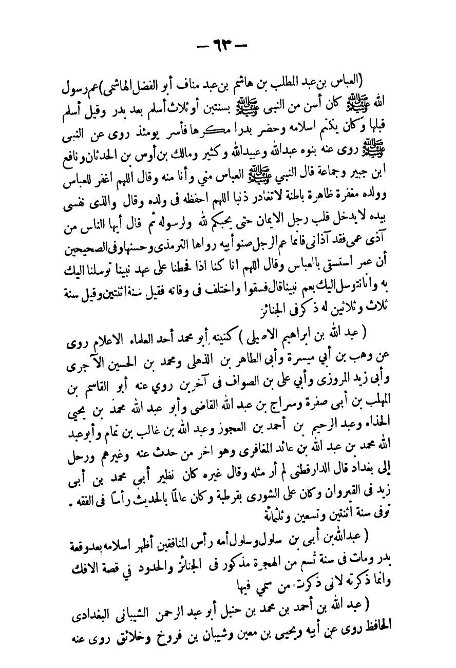 الْعَبَّاسُ بْنُ عَبْدِ الْمُطَّلِبِ بْنِ هَاشِمِ بْنِ عَبْدِ مَنَافٍ أَبُو الْفَضْلِ الْهَاشِمِيُّ) عَمُّ رَسُولِ اللَّهِ - صَلَّى اللَّهُ عَلَيْهِ وَسَلَّمَ - كَانَ أَسَنَّ مِنْ النَّبِيِّ - صَلَّى اللَّهُ عَلَيْهِ وَسَلَّمَ - بِسَنَتَيْنِ أَوْ ثَلَاثٍ أَسْلَمَ بَعْدَ بَدْرٍ، وَقِيلَ: أَسْلَمَ قَبْلَهَا، وَكَانَ يَكْتُمُ إسْلَامَهُ وَحَضَرَ بَدْرًا مُكْرَهًا فَأُسِرَ يَوْمَئِذٍ رَوَى عَنْ النَّبِيِّ - صَلَّى اللَّهُ عَلَيْهِ وَسَلَّمَ -، رَوَى عَنْهُ بَنُوهُ عَبْدُ اللَّهِ وَعُبَيْدُ اللَّهِ وَكَثِيرٌ وَمَالِكُ بْنُ أَوْسِ بْنِ الْحَدَثَانِ وَنَافِعُ بْنُ جُبَيْرٍ وَجَمَاعَةٌ «، قَالَ النَّبِيُّ - صَلَّى اللَّهُ عَلَيْهِ وَسَلَّمَ -: الْعَبَّاسُ مِنِّي وَأَنَا مِنْهُ» . «، وَقَالَ: اللَّهُمَّ اغْفِرْ لِلْعَبَّاسِ وَوَلَدِهِ، مَغْفِرَةً ظَاهِرَةً بَاطِنَةً لَا تُغَادِرُ ذَنْبًا اللَّهُمَّ احْفَظْهُ فِي وَلَدِهِ» . وَقَالَ: «وَاَلَّذِي نَفْسِي بِيَدِهِ لَا يَدْخُلُ قَلْبَ رَجُلٍ الْإِيمَانُ حَتَّى يُحِبَّكُمْ لِلَّهِ وَلِرَسُولِهِ» . «، ثُمَّ قَالَ: أَيُّهَا النَّاسُ مَنْ آذَى عَمِّي فَقَدْ آذَانِي فَإِنَّمَا عَمُّ الرَّجُلِ صِنْوُ أَبِيهِ» رَوَاهَا التِّرْمِذِيُّ وَحَسَّنَهَا. وَفِي الصَّحِيحَيْنِ أَنَّ عُمَرَ اسْتَسْقَى بِالْعَبَّاسِ وَقَالَ: اللَّهُمَّ إنَّا كُنَّا إذَا قُحِطْنَا عَلَى عَهْدِ نَبِيِّنَا تَوَسَّلْنَا إلَيْك بِهِ، وَإِنَّا نَتَوَسَّلُ إلَيْك بِعَمِّ نَبِيِّنَا قَالَ فَسُقُوا وَاخْتُلِفَ فِي وَفَاتِهِ فَقِيلَ: سَنَةَ اثْنَتَيْنِ وَقِيلَ: سَنَةَ ثَلَاثٍ وَثَلَاثِينَ لَهُ ذِكْرٌ فِي الْجَنَائِزِ.