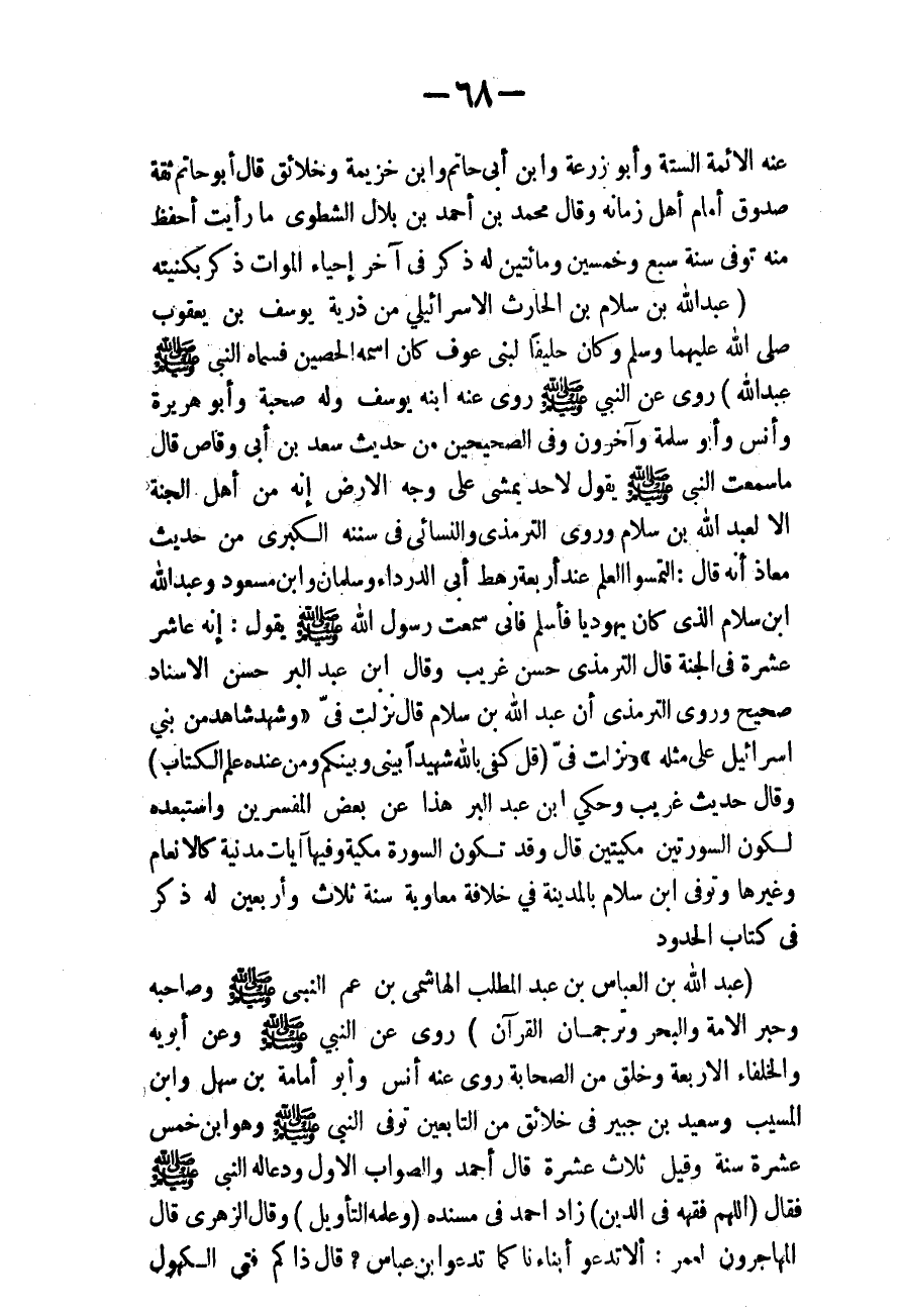(عَبْدُ اللَّهِ بْنُ سَلَامِ بْنِ الْحَارِثِ الْإِسْرَائِيلِيُّ مِنْ ذُرِّيَّةِ يُوسُفَ بْنِ يَعْقُوبَ - صَلَّى اللَّهُ عَلَيْهِمَا وَسَلَّمَ - وَكَانَ حَلِيفًا لِبَنِي عَوْفٍ، كَانَ اسْمُهُ الْحُصَيْنَ فَسَمَّاهُ النَّبِيُّ - صَلَّى اللَّهُ عَلَيْهِ وَسَلَّمَ - عَبْدَ اللَّهِ) رَوَى عَنْ النَّبِيِّ - صَلَّى اللَّهُ عَلَيْهِ وَسَلَّمَ -، رَوَى عَنْهُ ابْنُهُ يُوسُفُ وَلَهُ صُحْبَةٌ وَأَبُو هُرَيْرَةَ وَأَنَسٌ وَأَبُو سَلَمَةَ وَآخَرُونَ وَفِي الصَّحِيحَيْنِ مِنْ حَدِيثِ سَعْدِ بْنِ أَبِي وَقَّاصٍ قَالَ: «مَا سَمِعْت النَّبِيَّ - صَلَّى اللَّهُ عَلَيْهِ وَسَلَّمَ - يَقُولُ لِأَحَدٍ يَمْشِي عَلَى وَجْهِ الْأَرْضِ إنَّهُ مِنْ أَهْلِ الْجَنَّةِ إلَّا لِعَبْدِ اللَّهِ بْنِ سَلَامٍ» . وَرَوَى التِّرْمِذِيُّ وَالنَّسَائِيُّ فِي سُنَنِهِ الْكُبْرَى مِنْ حَدِيثِ مُعَاذٍ أَنَّهُ قَالَ: «الْتَمِسُوا الْعِلْمَ عِنْدَ أَرْبَعَةِ رَهْطٍ أَبِي الدَّرْدَاءِ وَسَلْمَانَ وَابْنِ مَسْعُودٍ وَعَبْدِ اللَّهِ بْنِ سَلَامٍ الَّذِي كَانَ يَهُودِيًّا فَأَسْلَمَ فَإِنِّي سَمِعْت رَسُولَ اللَّهِ - صَلَّى اللَّهُ عَلَيْهِ وَسَلَّمَ - يَقُولُ: إنَّهُ عَاشِرُ عَشْرَةٍ فِي الْجَنَّةِ» قَالَ التِّرْمِذِيُّ حَسَنٌ غَرِيبٌ. وَقَالَ ابْنُ عَبْدِ الْبَرِّ: حَسَنُ الْإِسْنَادِ صَحِيحٌ. وَرَوَى التِّرْمِذِيُّ أَنَّ عَبْدَ اللَّهِ بْنَ سَلَامٍ قَالَ: نَزَلَتْ فِي {وَشَهِدَ شَاهِدٌ مِنْ بَنِي إِسْرَائِيلَ عَلَى مِثْلِهِ} [الأحقاف: 10] وَنَزَلَتْ فِي {قُلْ كَفَى بِاللَّهِ شَهِيدًا بَيْنِي وَبَيْنَكُمْ وَمَنْ عِنْدَهُ عِلْمُ الْكِتَابِ} [الرعد: 43] وَقَالَ حَدِيثٌ غَرِيبٌ. وَحَكَى ابْنُ عَبْدِ الْبَرِّ هَذَا عَنْ بَعْضِ الْمُفَسِّرِينَ، وَاسْتَبْعَدَهُ لِكَوْنِ السُّورَتَيْنِ مَكِّيَّتَيْنِ، قَالَ: وَقَدْ تَكُونُ السُّورَةُ مَكِّيَّةً وَفِيهَا آيَاتٌ مَدِينَةٌ كَالْأَنْعَامِ وَغَيْرِهَا، وَتُوُفِّيَ ابْنُ سَلَامٍ بِالْمَدِينَةِ فِي خِلَافَةِ مُعَاوِيَةَ سَنَةَ ثَلَاثٍ وَأَرْبَعِينَ لَهُ ذِكْرٌ فِي كِتَابِ الْحُدُودِ.