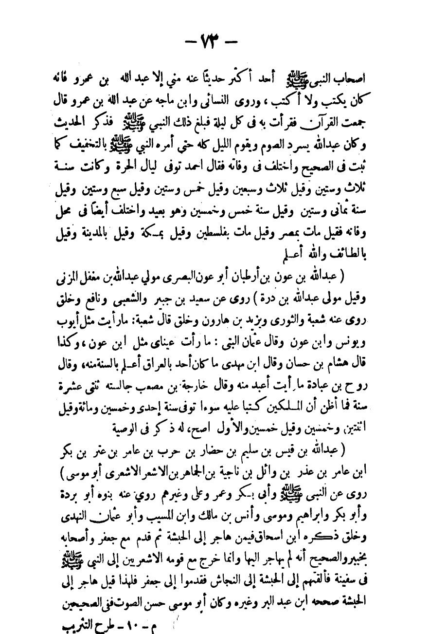 ـــــــــــــــــــــــــــــQأَصْحَابِ النَّبِيِّ - صَلَّى اللَّهُ عَلَيْهِ وَسَلَّمَ - أَحَدٌ أَكْثَرُ حَدِيثًا عَنْهُ مِنِّي إلَّا عَبْدَ اللَّهِ بْنَ عَمْرٍو فَإِنَّهُ كَانَ يَكْتُبُ وَلَا أَكْتُبُ. وَرَوَى النَّسَائِيّ وَابْنُ مَاجَهْ عَنْ «عَبْدِ اللَّهِ بْنِ عَمْرٍو قَالَ جَمَعْت الْقُرْآنَ فَقَرَأْتُ بِهِ فِي كُلِّ لَيْلَةٍ، فَبَلَغَ ذَلِكَ النَّبِيَّ - صَلَّى اللَّهُ عَلَيْهِ وَسَلَّمَ -» فَذَكَرَ الْحَدِيثَ. «وَكَانَ عَبْدُ اللَّهِ يَسْرُدُ الصَّوْمَ وَيَقُومُ اللَّيْلَ كُلَّهُ حَتَّى أَمَرَهُ النَّبِيُّ - صَلَّى اللَّهُ عَلَيْهِ وَسَلَّمَ - بِالتَّخْفِيفِ» كَمَا ثَبَتَ فِي الصَّحِيحِ. وَاخْتُلِفَ فِي وَفَاتِهِ فَقَالَ أَحْمَدُ: تُوُفِّيَ لَيَالِيَ الْحَرَّةِ، وَكَانَتْ سَنَةَ ثَلَاثٍ وَسِتِّينَ، وَقِيلَ: ثَلَاثٍ وَسَبْعِينَ وَقِيلَ خَمْسٍ وَسِتِّينَ، وَقِيلَ سَبْعٍ وَسِتِّينَ وَقِيلَ سَنَةَ ثَمَانٍ وَسِتِّينَ وَقِيلَ: سَنَةَ خَمْسٍ وَخَمْسِينَ وَهُوَ بَعِيدٌ. وَاخْتُلِفَ أَيْضًا فِي مَحَلِّ وَفَاتِهِ فَقِيلَ مَاتَ بِمِصْرَ، وَقِيلَ مَاتَ بِفِلَسْطِينَ، وَقِيلَ بِمَكَّةَ وَقِيلَ بِالْمَدِينَةِ وَقِيلَ بِالطَّائِفِ وَاَللَّهُ أَعْلَمُ.