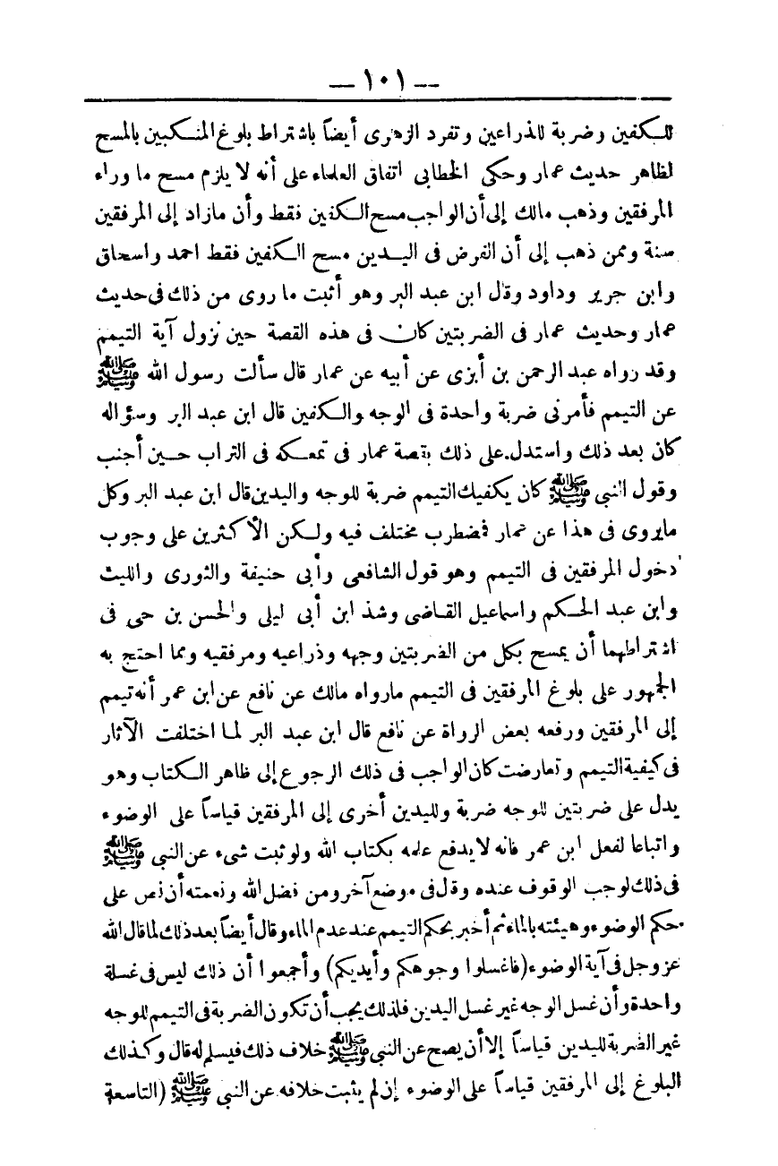 قَالَ ابْنُ عَبْدِ الْبَرِّ: وَكُلُّ مَا يُرْوَى فِي هَذَا عَنْ عَمَّارٍ فَمُضْطَرِبٌ مُخْتَلَفٌ فِيهِ وَلَكِنَّ الْأَكْثَرِينَ عَلَى وُجُوبِ دُخُولِ الْمِرْفَقَيْنِ فِي التَّيَمُّمِ، وَهُوَ قَوْلُ الشَّافِعِيِّ وَأَبِي حَنِيفَةَ وَالثَّوْرِيِّ وَاللَّيْثِ وَابْنِ عَبْدِ الْحَكَمِ وَإِسْمَاعِيلِ الْقَاضِي وَشَذَّ ابْنُ أَبِي لَيْلَى وَالْحَسَنُ بْنُ حُيَيِّ فِي اشْتِرَاطِهِمَا أَنْ يَمْسَحَ بِكُلٍّ مِنْ الضَّرْبَتَيْنِ وَجْهَهُ وَذِرَاعَيْهِ وَمِرْفَقَيْهِ، وَمِمَّا احْتَجَّ بِهِ الْجُمْهُورُ عَلَى بُلُوغِ الْمِرْفَقَيْنِ فِي التَّيَمُّمِ مَا رَوَاهُ مَالِكٌ عَنْ نَافِعٍ عَنْ ابْنِ عُمَرَ «أَنَّهُ تَيَمَّمَ إلَى الْمِرْفَقَيْنِ» . وَرَفَعَهُ بَعْضُ الرُّوَاةِ عَنْ نَافِعٍ