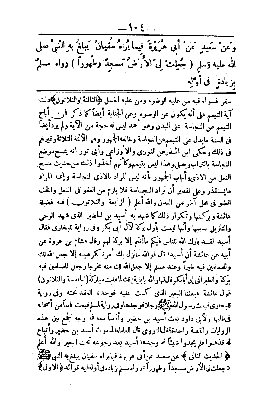{الْحَدِيثُ الثَّانِي} عَنْ سَعِيدٍ عَنْ أَبِي هُرَيْرَةَ فِيمَا يُرَاهُ سُفْيَانُ يَبْلُغُ بِهِ النَّبِيَّ - صَلَّى اللَّهُ عَلَيْهِ وَسَلَّمَ -: «جُعِلَتْ لِي الْأَرْضُ مَسْجِدًا وَطَهُورًا» رَوَاهُ مُسْلِمٌ بِزِيَادَةِ فِي أَوَّلِهِ فِيهِ فَوَائِدُ: