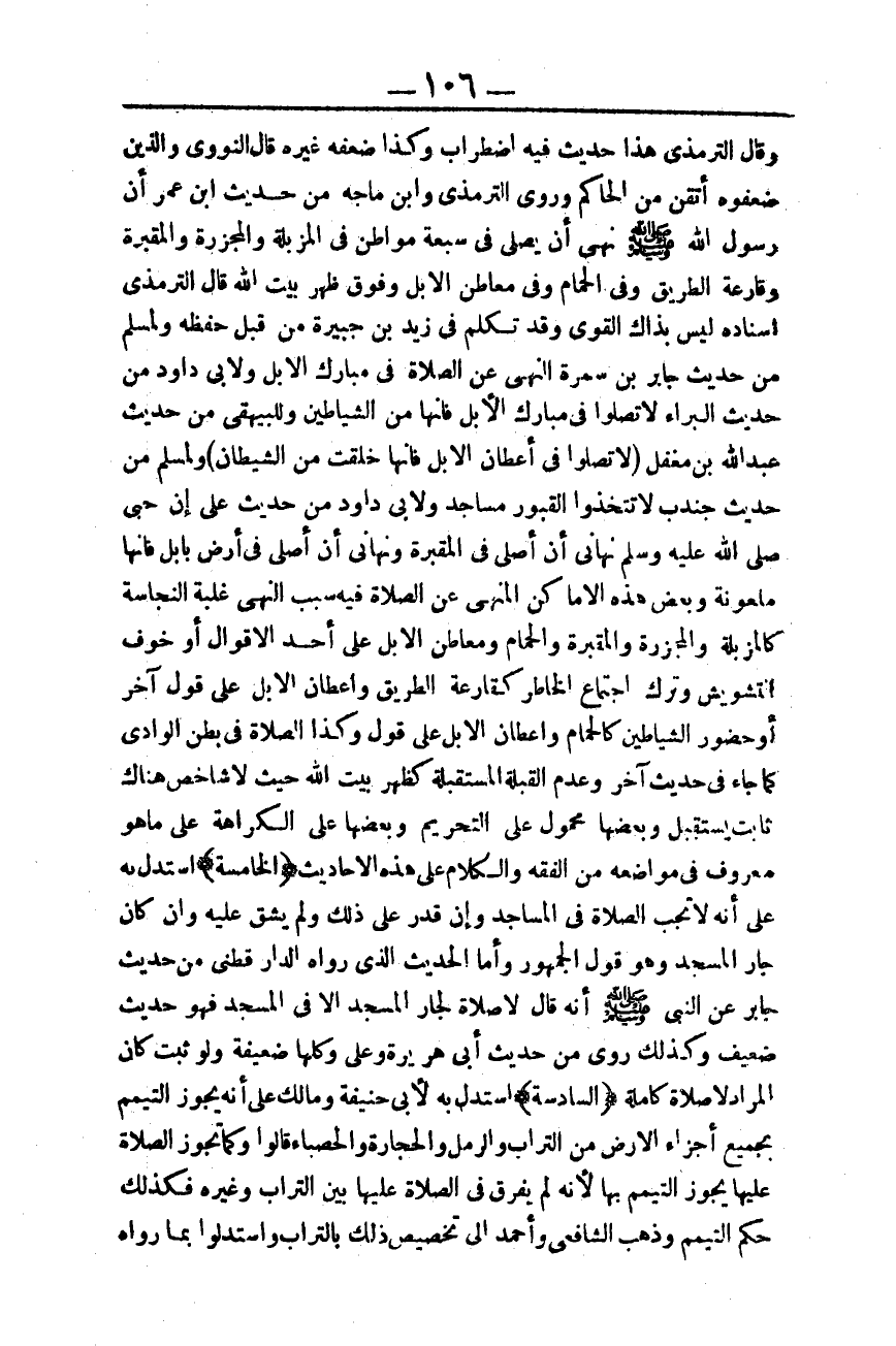 وَرَوَى التِّرْمِذِيُّ وَابْنُ مَاجَهْ مِنْ حَدِيثِ ابْنِ عُمَرَ أَنَّ رَسُولَ اللَّهِ - صَلَّى اللَّهُ عَلَيْهِ وَسَلَّمَ - «نَهَى أَنْ يُصَلَّى فِي سَبْعَةِ مَوَاطِنَ فِي الْمَزْبَلَةِ، وَالْمَجْزَرَةِ، وَالْمَقْبَرَةِ وَقَارِعَةِ الطَّرِيقِ وَفِي الْحَمَّامِ وَفِي مَعَاطِنِ الْإِبِلِ وَفَوْقَ ظَهْرِ بَيْتِ اللَّه» قَالَ التِّرْمِذِيُّ إسْنَادُهُ لَيْسَ بِذَاكَ الْقَوِيِّ.