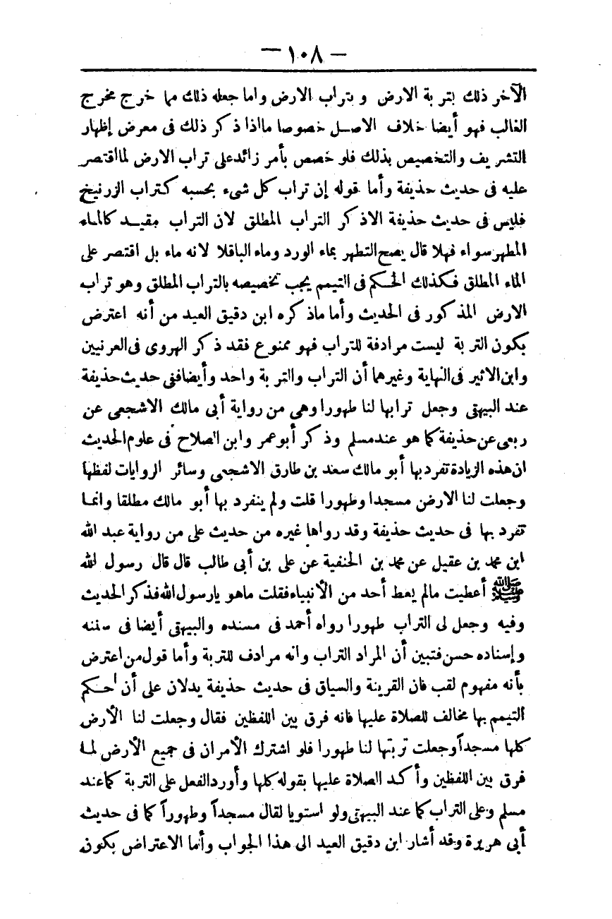 وَقَدْ رَوَاهَا غَيْرُهُ مِنْ حَدِيثِ عَلِيٍّ مِنْ رِوَايَةِ عَبْدِ اللَّهِ بْنِ مُحَمَّدِ بْنِ عَقِيلٍ عَنْ مُحَمَّدِ بْنِ الْحَنَفِيَّةِ عَنْ عَلِيِّ بْنِ أَبِي طَالِبٍ قَالَ قَالَ رَسُولُ اللَّهِ - صَلَّى اللَّهُ عَلَيْهِ وَسَلَّمَ - «أُعْطِيت مَا لَمْ يُعْطَ أَحَدٌ مِنْ الْأَنْبِيَاءِ فَقُلْت: مَا هُوَ يَا رَسُولَ اللَّهِ» فَذَكَرَ الْحَدِيثَ وَفِيهِ «وَجُعِلَ لِي التُّرَابُ طَهُورًا» رَوَاهُ أَحْمَدُ فِي مُسْنَدِهِ، وَالْبَيْهَقِيُّ أَيْضًا فِي سُنَنِهِ وَإِسْنَادُهُ حَسَنٌ فَتَبَيَّنَ أَنَّ الْمُرَادَ التُّرَابُ وَأَنَّهُ مُرَادِفٌ لِلتُّرْبَةِ.