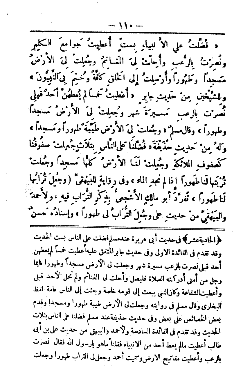 «فُضِّلْت عَلَى الْأَنْبِيَاءِ بِسِتٍّ: أُعْطِيت جَوَامِعَ الْكَلِمِ وَنُصِرْت بِالرُّعْبِ وَأُحِلَّتْ لِي الْمَغَانِمُ وَجُعِلَتْ لِي الْأَرْضُ مَسْجِدًا وَطَهُورًا وَأُرْسِلْت إلَى الْخَلْقِ كَافَّةً وَخُتِمَ بِي النَّبِيُّونَ» وَلِلشَّيْخَيْنِ مِنْ حَدِيثِ جَابِرٍ «أُعْطِيت خَمْسًا لَمْ يُعْطَهُنَّ أَحَدٌ قَبْلِي نُصِرْت بِالرُّعْبِ مَسِيرَةَ شَهْرٍ وَجُعِلَتْ لِي الْأَرْضُ مَسْجِدًا وَطَهُورًا» وَقَالَ مُسْلِمٌ «وَجُعِلْت لِي الْأَرْضُ طَيِّبَةً طَهُورًا وَمَسْجِدًا» وَلَهُ مِنْ حَدِيثِ حُذَيْفَةَ «فُضِّلْنَا عَلَى النَّاسِ بِثَلَاثٍ جُعِلَتْ صُفُوفُنَا كَصُفُوفِ الْمَلَائِكَةِ وَجُعِلَتْ لَنَا الْأَرْضُ كُلُّهَا مَسْجِدًا وَجُعِلَتْ تُرْبَتُهَا لَنَا طَهُورًا إذَا لَمْ نَجِدْ الْمَاءَ» .