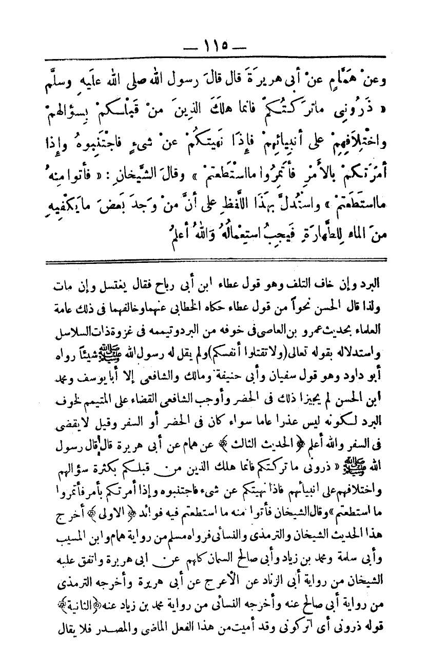 وَعَنْ هَمَّامٍ عَنْ أَبِي هُرَيْرَةَ قَالَ قَالَ رَسُولُ اللَّهِ - صَلَّى اللَّهُ عَلَيْهِ وَسَلَّمَ - «ذَرُونِي مَا تَرَكْتُكُمْ فَإِنَّمَا هَلَكَ الَّذِينَ مِنْ قَبْلِكُمْ بِسُؤَالِهِمْ وَاخْتِلَافِهِمْ عَلَى أَنْبِيَائِهِمْ فَإِذَا نَهَيْتُكُمْ عَنْ شَيْءٍ فَاجْتَنِبُوهُ، وَإِذَا أَمَرْتُكُمْ بِالْأَمْرِ فَائْتَمِرُوا مَا اسْتَطَعْتُمْ» وَقَالَ الشَّيْخَانِ: «فَأْتُوا مِنْهُ مَا اسْتَطَعْتُمْ» ، اُسْتُدِلَّ بِهَذَا اللَّفْظِ عَلَى أَنَّ مَنْ وَجَدَ بَعْضَ مَا يَكْفِيهِ مِنْ الْمَاءِ لِلطَّهَارَةِ فَيَجِبُ اسْتِعْمَالُهُ وَاَللَّهُ أَعْلَمُ..