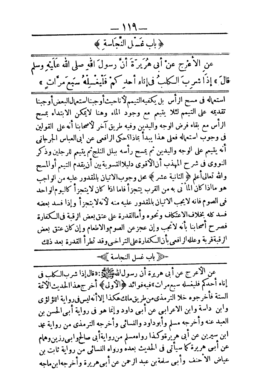 {بَابُ غَسْلِ النَّجَاسَةِ} عَنْ الْأَعْرَجِ عَنْ أَبِي هُرَيْرَةَ أَنَّ رَسُولَ اللَّهِ - صَلَّى اللَّهُ عَلَيْهِ وَسَلَّمَ - قَالَ: «إذَا شَرِبَ الْكَلْبُ فِي إنَاءِ أَحَدِكُمْ فَلْيَغْسِلْهُ سَبْعَ مَرَّاتٍ» فِيهِ فَوَائِدُ: