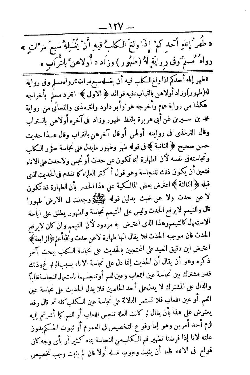 «طُهْرُ إنَاءِ أَحَدِكُمْ إذَا وَلَغَ الْكَلْبُ فِيهِ أَنْ يَغْسِلَهُ سَبْعَ مَرَّاتٍ» رَوَاهُ مُسْلِمٌ وَفِي رِوَايَةٍ لَهُ (طَهُورُ) وَزَادَ «أُولَاهُنَّ بِالتُّرَابِ»
