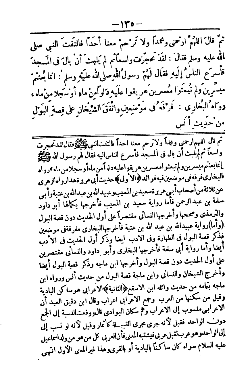 ثُمَّ قَالَ: اللَّهُمَّ ارْحَمْنِي وَمُحَمَّدًا وَلَا تَرْحَمْ مَعَنَا أَحَدًا فَالْتَفَتَ النَّبِيُّ - صَلَّى اللَّهُ عَلَيْهِ وَسَلَّمَ - فَقَالَ: لَقَدْ تَحَجَّرْت وَاسِعًا، ثُمَّ لَمْ يَلْبَثْ أَنْ بَالَ فِي الْمَسْجِدِ فَأَسْرَعَ النَّاسُ إلَيْهِ فَقَالَ لَهُمْ رَسُولُ اللَّهِ - صَلَّى اللَّهُ عَلَيْهِ وَسَلَّمَ -: إنَّمَا بُعِثْتُمْ مُيَسِّرِينَ وَلَمْ تُبْعَثُوا مُعَسِّرِينَ هَرِيقُوا عَلَيْهِ دَلْوًا مِنْ مَاءٍ أَوْ سَجْلًا مِنْ مَاءٍ» ، رَوَاهُ الْبُخَارِيُّ: فَرَّقَهُ فِي مَوْضِعَيْنِ وَاتَّفَقَ الشَّيْخَانِ عَلَى قِصَّةِ الْبَوْلِ مِنْ حَدِيثِ أَنَسٍ.