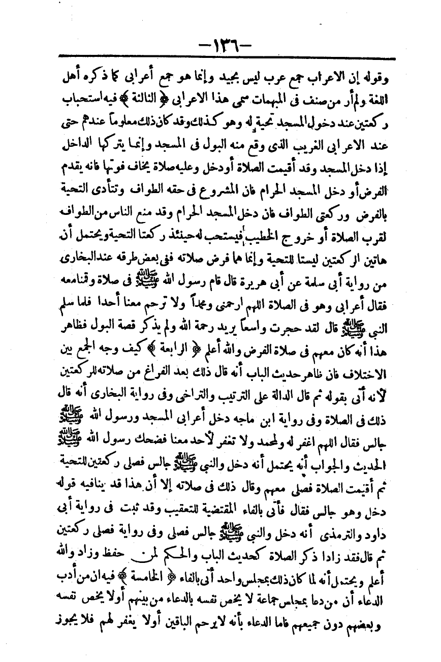 {الثَّالِثَةُ} فِيهِ اسْتِحْبَابُ رَكْعَتَيْنِ عِنْدَ دُخُولِ الْمَسْجِدِ تَحِيَّةً لَهُ، وَهُوَ كَذَلِكَ، وَقَدْ كَانَ ذَلِكَ مَعْلُومًا عِنْدَهُمْ حَتَّى عِنْدَ الْأَعْرَابِيِّ الْغَرِيبِ الَّذِي وَقَعَ مِنْهُ الْبَوْلُ فِي الْمَسْجِدِ، وَإِنَّمَا يَتْرُكُهَا الدَّاخِلُ إذَا دَخَلَ الْمَسْجِدَ، وَقَدْ أُقِيمَتْ الصَّلَاةُ أَوْ دَخَلَ وَعَلَيْهِ صَلَاةٌ يَخَافُ فَوْتَهَا، فَإِنَّهُ يُقَدِّمُ الْفَرْضَ أَوْ دَخَلَ الْمَسْجِدَ الْحَرَامَ، فَإِنَّ الْمَشْرُوعَ فِي حَقِّهِ الطَّوَافُ وَتَتَأَدَّى التَّحِيَّةُ بِالْفَرْضِ وَرَكْعَتَيْ الطَّوَافِ، فَإِنْ دَخَلَ الْمَسْجِدَ الْحَرَامَ، وَقَدْ مَنَعَ النَّاسَ مِنْ الطَّوَافِ لِقُرْبِ الصَّلَاةِ أَوْ خُرُوجِ الْخَطِيبِ فَيُسْتَحَبُّ لَهُ حِينَئِذٍ رَكْعَتَا التَّحِيَّةِ وَيُحْتَمَلُ أَنَّ هَاتَيْنِ الرَّكْعَتَيْنِ لَيْسَتَا لِلتَّحِيَّةِ، وَإِنَّمَا هُمَا فَرْضُ صَلَاتِهِ فَفِي بَعْضِ طُرُقِهِ عِنْدَ الْبُخَارِيِّ مِنْ رِوَايَةِ أَبِي سَلَمَةَ عَنْ أَبِي هُرَيْرَةَ قَالَ «قَامَ رَسُولُ اللَّهِ - صَلَّى اللَّهُ عَلَيْهِ وَسَلَّمَ - فِي صَلَاةٍ وَقُمْنَا مَعَهُ فَقَالَ أَعْرَابِيٌّ، وَهُوَ فِي الصَّلَاةِ: اللَّهُمَّ ارْحَمْنِي وَمُحَمَّدًا وَلَا تَرْحَمْ مَعَنَا أَحَدًا فَلَمَّا سَلَّمَ النَّبِيُّ - صَلَّى اللَّهُ عَلَيْهِ وَسَلَّمَ - قَالَ: لَقَدْ حَجَّرْت وَاسِعًا» يُرِيدُ رَحْمَةَ اللَّهِ وَلَمْ يَذْكُرْ قِصَّةَ الْبَوْلِ فَظَاهِرُ هَذَا أَنَّهُ كَانَ مَعَهُمْ فِي صَلَاةِ الْفَرْضِ وَاَللَّهُ أَعْلَمُ.