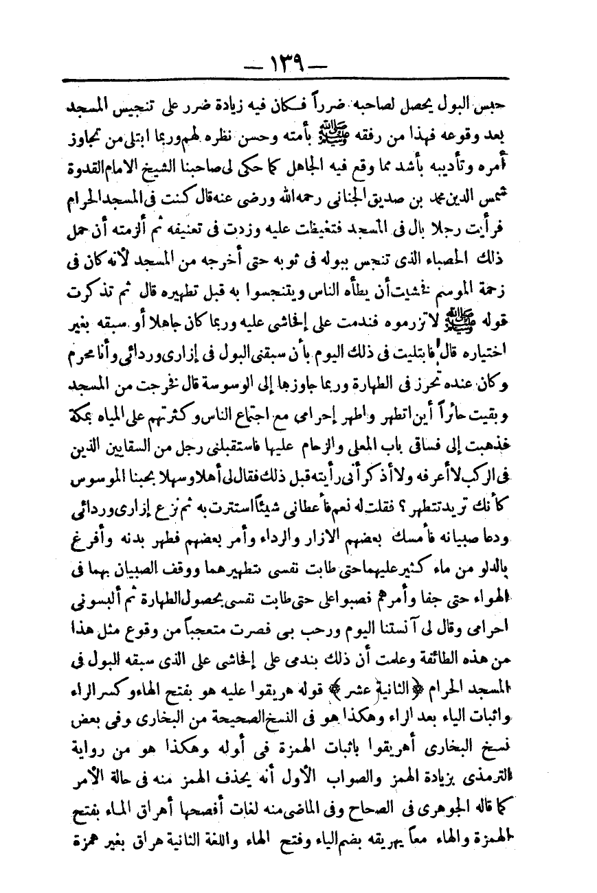 ـــــــــــــــــــــــــــــQحَبْسَ الْبَوْلِ يُحَصِّلُ لِصَاحِبِهِ ضَرَرًا فَكَانَ فِيهِ زِيَادَةُ ضَرَرٍ عَلَى تَنْجِيسِ الْمَسْجِدِ بَعْدَ وُقُوعِهِ فَهَذَا مِنْ رِفْقِهِ - صَلَّى اللَّهُ عَلَيْهِ وَسَلَّمَ - بِأُمَّتِهِ وَحُسْنِ نَظَرِهِ لَهُمْ وَرُبَّمَا اُبْتُلِيَ مَنْ تَجَاوَزَ أَمْرَهُ وَتَأْدِيبَهُ بِأَشَدَّ مِمَّا وَقَعَ فِيهِ الْجَاهِلُ كَمَا حَكَى لِي صَاحِبُنَا الشَّيْخُ الْإِمَامُ الْقُدْوَةُ شَمْسُ الدِّينِ مُحَمَّدُ بْنُ صِدِّيقٍ الْجَنَانِيُّ - رَحِمَهُ اللَّهُ - وَرَضِيَ عَنْهُ قَالَ: كُنْت فِي الْمَسْجِدِ الْحَرَامِ فَرَأَيْت رَجُلًا بَالَ فِي الْمَسْجِدِ فَتَغَيَّظْتُ عَلَيْهِ وَزِدْت فِي تَعْنِيفِهِ، ثُمَّ أَلْزَمْتُهُ أَنْ حَمَلَ ذَلِكَ الْحَصْبَاءَ الَّذِي تَنَجَّسَ بِبَوْلِهِ فِي ثَوْبِهِ حَتَّى أَخْرَجَهُ مِنْ الْمَسْجِدِ؛ لِأَنَّهُ كَانَ فِي زَحْمَةِ الْمَوْسِمِ فَخَشِيت أَنْ يَطَأَهُ النَّاسُ وَيَتَنَجَّسُوا بِهِ قَبْلَ تَطْهِيرِهِ قَالَ: ثُمَّ تَذَكَّرْت قَوْلَهُ: - صَلَّى اللَّهُ عَلَيْهِ وَسَلَّمَ - لَا تَزْرِمُوهُ فَنَدِمْت عَلَى إفْحَاشِي عَلَيْهِ وَرُبَّمَا كَانَ جَاهِلًا أَوْ سَبَقَهُ بِغَيْرِ اخْتِيَارِهِ قَالَ: فَابْتُلِيت فِي ذَلِكَ الْيَوْمِ بِأَنْ سَبَقَنِي الْبَوْلُ فِي إزَارِي وَرِدَائِي وَأَنَا مُحْرِمٌ وَكَانَ عِنْدَهُ تَحَرُّزٌ فِي الطَّهَارَةِ، وَرُبَّمَا جَاوَزَهَا إلَى الْوَسْوَسَةِ قَالَ فَخَرَجْت مِنْ الْمَسْجِدِ وَبَقِيت حَائِرًا أَيْنَ أَتَطَهَّرُ وَأُطَهِّرُ إحْرَامِي مَعَ اجْتِمَاعِ النَّاسِ وَكَثْرَتِهِمْ عَلَى الْمِيَاهِ بِمَكَّةَ فَذَهَبْت إلَى فَسَاقِي بَابِ الْمُعَلَّى، وَالزِّحَامُ عَلَيْهَا فَاسْتَقْبَلَنِي رَجُلٌ مِنْ السَّقَّايِينَ الَّذِينَ فِي الرَّكْبِ لَا أَعْرِفُهُ وَلَا أَذْكُرُ أَنِّي رَأَيْته قَبْلَ ذَلِكَ فَقَالَ لِي أَهْلًا وَسَهْلًا بِحُبِّنَا الْمُوَسْوِسِ كَأَنَّك تُرِيدُ تَتَطَهَّرُ؟ فَقُلْت لَهُ: نَعَمْ فَأَعْطَانِي شَيْئًا اسْتَتَرْت بِهِ، ثُمَّ نَزَعَ إزَارِي وَرِدَائِي وَدَعَا صِبْيَانَهُ فَأَمْسَكَ بَعْضَهُمْ الْإِزَارَ وَالرِّدَاءَ وَأَمَرَ بَعْضَهُمْ فَطَهَّرَ بَدَنَهُ وَأَفْرَغَ بِالدَّلْوِ مِنْ مَاءٍ كَثِيرٍ عَلَيْهِمَا حَتَّى طَابَتْ نَفْسِي بِتَطْهِيرِهِمَا وَوَقَفَ الصِّبْيَانُ بِهِمَا فِي الْهَوَاءِ حَتَّى جَفَّا وَأَمَرَهُمْ فَصَبُّوا عَلَيَّ حَتَّى طَابَتْ نَفْسِي بِحُصُولِ الطَّهَارَةِ، ثُمَّ أَلْبَسُونِي إحْرَامِي وَقَالَ لِي آنَسْتنَا الْيَوْمَ وَرَحَّبَ بِي فَصِرْت مُتَعَجِّبًا مِنْ وُقُوعِ مِثْلِ هَذَا مِنْ هَذِهِ الطَّائِفَةِ وَعَلِمْت أَنَّ ذَلِكَ بِنَدَمِي عَلَى إفْحَاشِي عَلَى الَّذِي سَبَقَهُ الْبَوْلُ فِي الْمَسْجِدِ الْحَرَامِ.