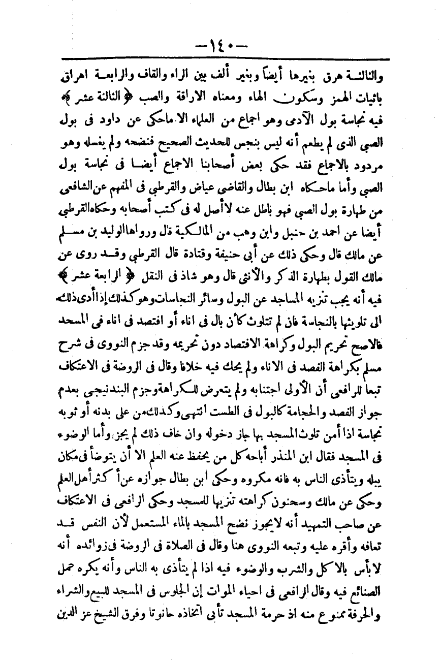 وَأَمَّا مَا حَكَاهُ ابْنُ بَطَّالٍ، وَالْقَاضِي عِيَاضٌ، وَالْقُرْطُبِيُّ فِي الْمُفْهِمِ عَنْ الشَّافِعِيِّ مِنْ طَهَارَةِ بَوْلِ الصَّبِيِّ فَهُوَ بَاطِلٌ عَنْهُ لَا أَصْلَ لَهُ فِي كُتُبِ أَصْحَابِهِ وَحَكَاهُ الْقُرْطُبِيُّ أَيْضًا عَنْ أَحْمَدَ بْنِ حَنْبَلٍ وَابْنِ وَهْبٍ مِنْ الْمَالِكِيَّةِ قَالَ: وَرَوَاهَا الْوَلِيدُ بْنُ مُسْلِمٍ عَنْ مَالِكٍ قَالَ وَحَكَى ذَلِكَ عَنْ أَبِي حَنِيفَةَ وَقَتَادَةَ قَالَ الْقُرْطُبِيُّ، وَقَدْ رُوِيَ عَنْ مَالِكٍ الْقَوْلُ بِطَهَارَةِ الذَّكَرِ، وَالْأُنْثَى قَالَ: وَهُوَ شَاذٌّ فِي النَّقْلِ.