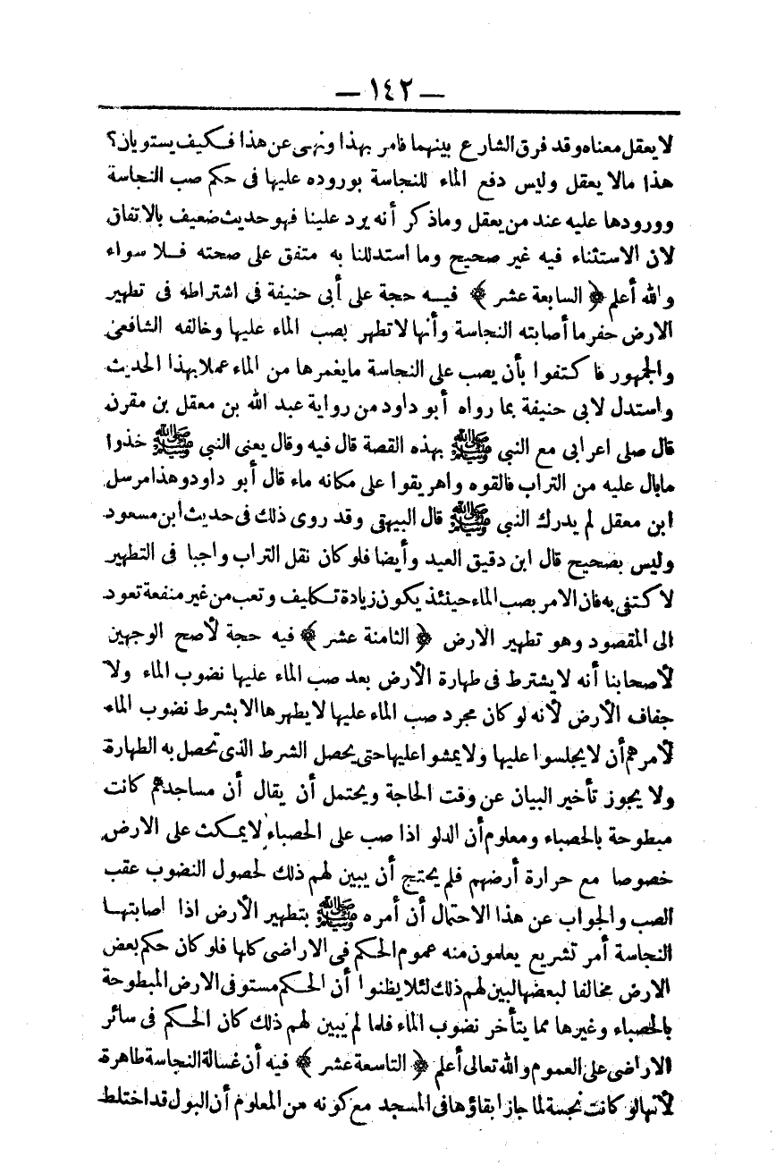 (السَّابِعَةَ عَشَرَ) فِيهِ حُجَّةٌ عَلَى أَبِي حَنِيفَةَ فِي اشْتِرَاطِهِ فِي تَطْهِيرِ الْأَرْضِ حَفْرَ مَا أَصَابَتْهُ النَّجَاسَةُ وَأَنَّهَا لَا تَطْهُرُ بِصَبِّ الْمَاءِ عَلَيْهَا وَخَالَفَهُ الشَّافِعِيُّ، وَالْجُمْهُورُ فَاكْتَفَوْا بِأَنْ يُصَبَّ عَلَى النَّجَاسَةِ مَا يَغْمُرُهَا مِنْ الْمَاءِ عَمَلًا بِهَذَا الْحَدِيثِ وَاسْتَدَلَّ لِأَبِي حَنِيفَةَ بِمَا رَوَاهُ أَبُو دَاوُد مِنْ رِوَايَةِ عَبْدِ اللَّهِ بْنِ مَعْقِلِ بْنِ مُقْرِنٍ قَالَ صَلَّى أَعْرَابِيٌّ مَعَ النَّبِيِّ - صَلَّى اللَّهُ عَلَيْهِ وَسَلَّمَ - بِهَذِهِ الْقِصَّةِ قَالَ فِيهِ وَقَالَ يَعْنِي النَّبِيَّ - صَلَّى اللَّهُ عَلَيْهِ وَسَلَّمَ -: خُذُوا مَا بَالَ عَلَيْهِ مِنْ التُّرَابِ فَأَلْقُوهُ وَهَرِيقُوا عَلَى مَكَانِهِ مَاءً.
