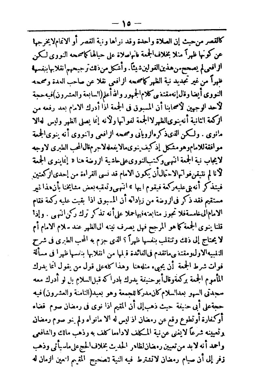 ـــــــــــــــــــــــــــــQكَالْقَصْرِ مِنْ حَيْثُ إنَّ الصَّلَاةَ وَاحِدَةٌ، وَقَدْ نَوَاهَا وَنِيَّةُ الْقَصْرِ أَوْ الْإِتْمَامِ لَا يُخْرِجُهَا عَنْ كَوْنِهَا ظُهْرًا مَثَلًا بِخِلَافِ الْجُمُعَةِ، فَإِنَّهَا صَلَاةٌ عَلَى حِيَالِهَا كَمَا صَحَّحَهُ النَّوَوِيُّ لَكِنَّ الرَّافِعِيَّ لَمْ يُصَحِّحْ مِنْ هَذَيْنِ الْقَوْلَيْنِ شَيْئًا.
