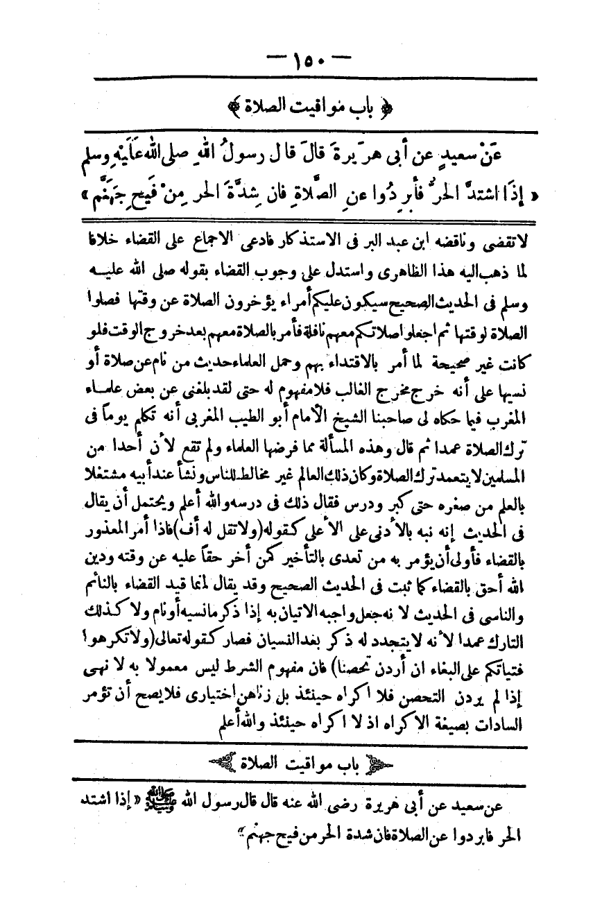 (بَابُ مَوَاقِيتِ الصَّلَاةِ) عَنْ سَعِيدٍ عَنْ أَبِي هُرَيْرَةَ - رَضِيَ اللَّهُ عَنْهُ - قَالَ قَالَ رَسُولُ اللَّهِ - صَلَّى اللَّهُ عَلَيْهِ وَسَلَّمَ -: «إذَا اشْتَدَّ الْحَرُّ فَأَبْرِدُوا عَنْ الصَّلَاةِ، فَإِنَّ شِدَّةَ الْحَرِّ مِنْ فَيْحِ جَهَنَّمَ» .