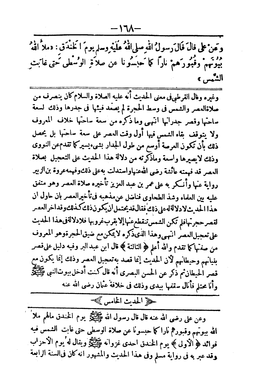(الْحَدِيثُ الْخَامِسُ) وَعَنْ عَلِيٍّ - رَضِيَ اللَّهُ عَنْهُ - قَالَ قَالَ رَسُولُ اللَّهِ - صَلَّى اللَّهُ عَلَيْهِ وَسَلَّمَ - يَوْمَ الْخَنْدَقِ «مَا لَهُمْ مَلَأَ اللَّهُ بُيُوتَهُمْ وَقُبُورَهُمْ نَارًا كَمَا حَبَسُونَا عَنْ صَلَاةِ الْوُسْطَى حَتَّى غَابَتْ الشَّمْسُ» فِيهِ فَوَائِدُ: