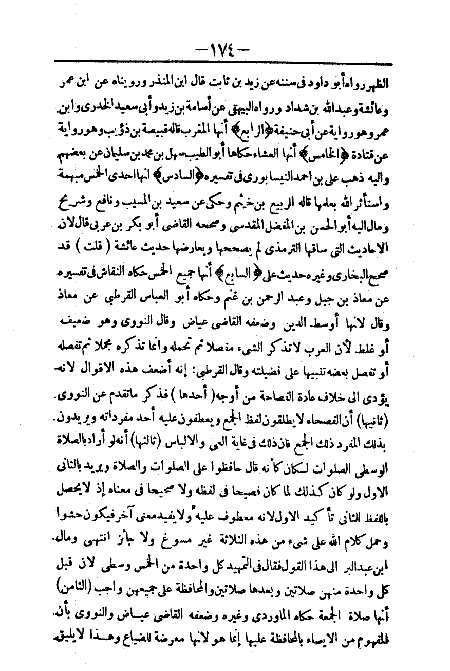 (السَّابِعُ) أَنَّهَا جَمِيعُ الْخَمْسِ حَكَاهُ النَّقَّاشُ فِي تَفْسِيرِهِ عَنْ مُعَاذِ بْنِ جَبَلٍ وَعَبْدِ الرَّحْمَنِ بْنِ غَنْمٍ وَحَكَاهُ أَبُو الْعَبَّاسِ الْقُرْطُبِيُّ عَنْ مُعَاذٍ وَقَالَ: لِأَنَّهَا أَوْسَطُ الدِّينِ وَضَعَّفَهُ الْقَاضِي عِيَاضٌ وَقَالَ النَّوَوِيُّ: وَهُوَ ضَعِيفٌ أَوْ غَلَطٌ؛ لِأَنَّ الْعَرَبَ لَا تَذْكُرُ الشَّيْءَ مُفَصَّلًا، ثُمَّ تَحْمِلُهُ، وَإِنَّمَا تَذْكُرُهُ مُجْمَلًا، ثُمَّ تُفَصِّلُهُ أَوْ تُفَصِّلُ بَعْضَهُ تَنْبِيهًا عَنْ فَضِيلَتِهِ، وَقَالَ الْقُرْطُبِيُّ: إنَّهُ أَضْعَفُ هَذِهِ الْأَقْوَالِ؛ لِأَنَّهُ يُؤَدِّي إلَى خِلَافِ عَادَةِ الْفَصَاحَةِ مِنْ أَوْجُهٍ:
