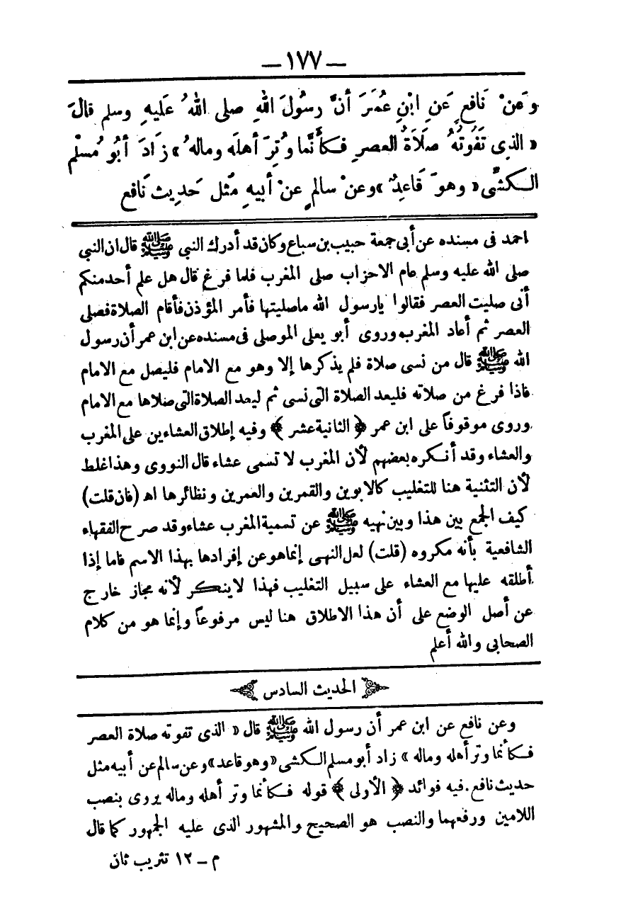 (الْحَدِيثُ السَّادِسُ) وَعَنْ نَافِعٍ عَنْ ابْنِ عُمَرَ أَنَّ رَسُولَ اللَّهِ - صَلَّى اللَّهُ عَلَيْهِ وَسَلَّمَ - قَالَ «الَّذِي تَفُوتُهُ صَلَاةُ الْعَصْرِ فَكَأَنَّمَا وُتِرَ أَهْلَهُ، وَمَالَهُ» زَادَ أَبُو مُسْلِمٍ الْكَشِّيُّ " وَهُوَ قَاعِدَةٌ " وَعَنْ سَالِمٍ عَنْ أَبِيهِ مِثْلُ حَدِيثِ نَافِعٍ. فِيهِ فَوَائِدُ:
