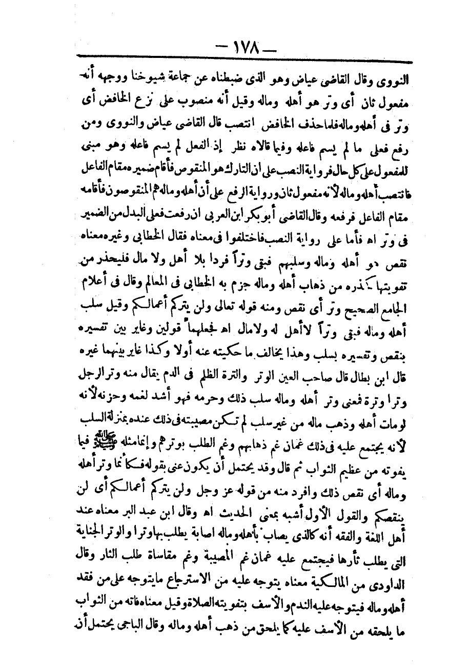 وَقَالَ الْقَاضِي عِيَاضٌ: وَهُوَ الَّذِي ضَبَطْنَاهُ عَنْ جَمَاعَةِ شُيُوخِنَا وَوَجْهُهُ أَنَّهُ مَفْعُولٌ ثَانٍ أَيْ وُتِرَ هُوَ أَهْلَهُ وَمَالَهُ وَقِيلَ إنَّهُ مَنْصُوبٌ عَلَى نَزْعِ الْخَافِضِ أَيْ وُتِرَ فِي أَهْلِهِ وَمَالِهِ فَلَمَّا حُذِفَ الْخَافِضُ انْتَصَبَ قَالَ الْقَاضِي عِيَاضٌ وَالنَّوَوِيُّ وَمَنْ رَفَعَ فَعَلَى مَا لَمْ يُسَمَّ فَاعِلُهُ وَفِيمَا قَالَاهُ نَظَرٌ إذْ الْفِعْلُ لَمْ يُسَمَّ فَاعِلُهُ، وَهُوَ مَبْنِيٌّ لِلْمَفْعُولِ عَلَى كُلِّ حَالٍ فَرِوَايَةُ النَّصْبِ عَلَى أَنَّ التَّارِكَ هُوَ الْمَنْقُوصُ فَأَقَامَ ضَمِيرَهُ مَقَامَ الْفَاعِلِ فَانْتَصَبَ أَهْلُهُ، وَمَالُهُ؛ لِأَنَّهُ مَفْعُولٌ ثَانٍ وَرِوَايَةُ الرَّفْعِ عَلَى أَنَّ أَهْلَهُ، وَمَالَهُ هُمْ الْمَنْقُوصُونَ فَأَقَامَهُ مَقَامَ الْفَاعِلِ فَرَفَعَهُ وَقَالَ الْقَاضِي أَبُو بَكْرِ بْنُ الْعَرَبِيِّ: إنْ رَفَعْت فَعَلَى الْبَدَلِ مِنْ الضَّمِيرِ فِي وُتِرَ أَهْلَهُ.